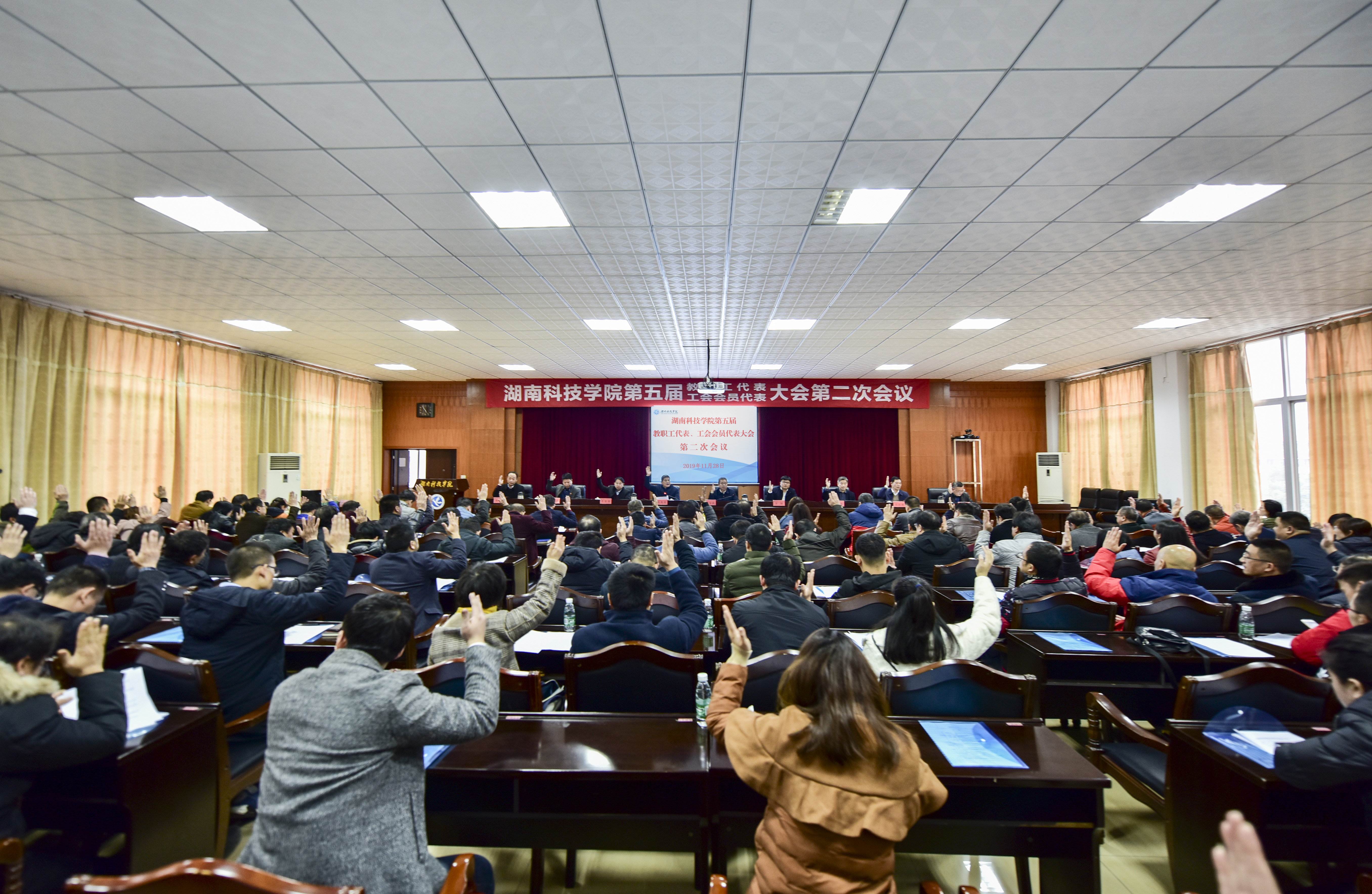 11月28日下午,学校第五届教职工代表、工会会员代表第二次会议在行政楼八楼一会议室召开。党委副书记、工会主席唐艳明主持会议。