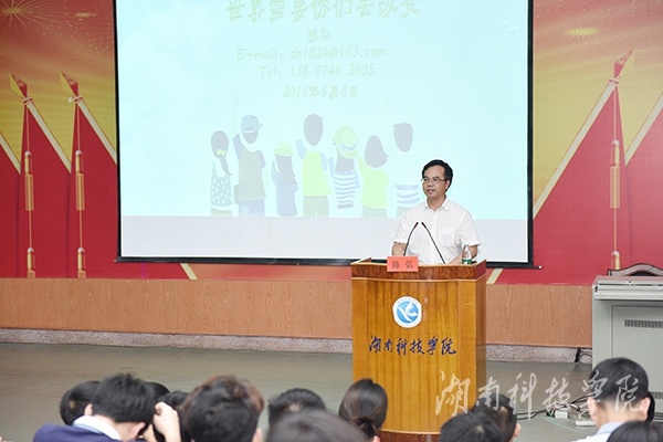 陈弘从哈佛大学本届毕业生何江的成长经历讲起,告诉同学们要勇敢担当促进共享与公平的社会责任。他说,教育、科技、医疗资源的不均衡分布导致人际不公平,我们要努力去改变。