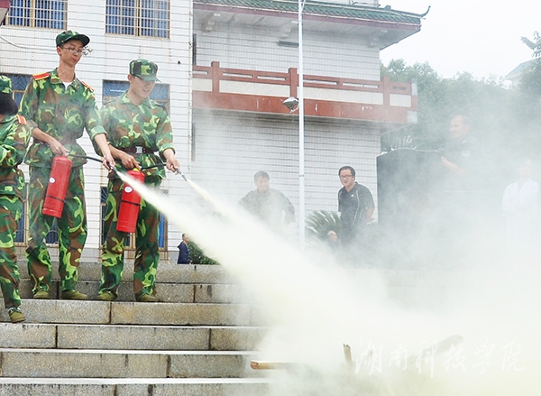 全体师生安全疏散完毕后,保卫处还联合消防大队教官对2015级新生就如何灭火、火场自救等进行安全知识培训,并现场演示灭火器的操作程序。