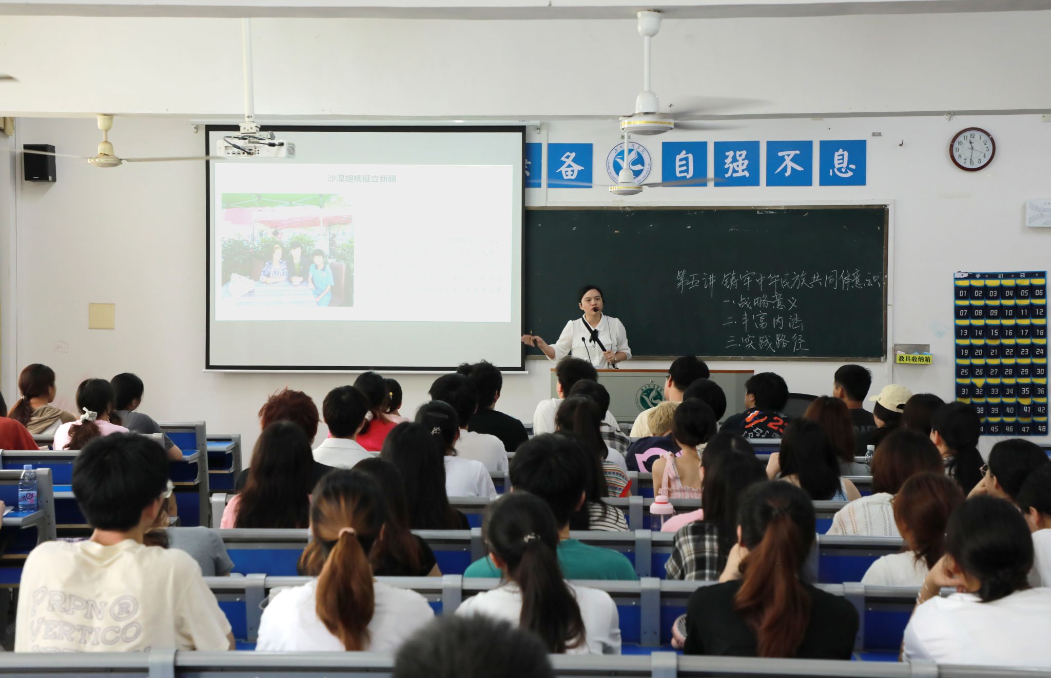 本网讯(记者 向薛峰 谢志豪)为深入学习贯彻习近平总书记关于学校思政课建设的重要指示精神和新时代学校思政课建设推进会精神,6月13日,校党委书记李钢、校长黄创霞等全体在校校领导随堂听取了马克思主义学院教师周梅所讲授的《铸牢中华民族共同体意识》形势政策课。