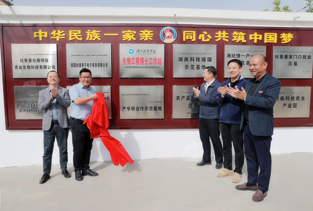 活动现场,湖南省人民政府副秘书长、援疆前方指挥部指挥长、吐鲁番市委副书记刘中杰,湖南省援疆前方指挥部副指挥长、吐鲁番市委组织部副部长、示范区党委副书记林亮亮与华体会官方版网站登录入口谢建伟博士、吐鲁番丝路明珠农业生物科技有限公司总经理王永旭及湖南吻野现代农业科技有限公司总经理罗令松共同为“华体会官方版网站登录入口生物工程博士工作站”揭牌。