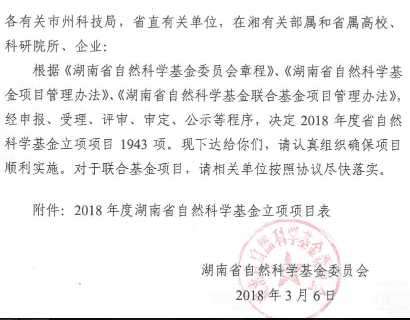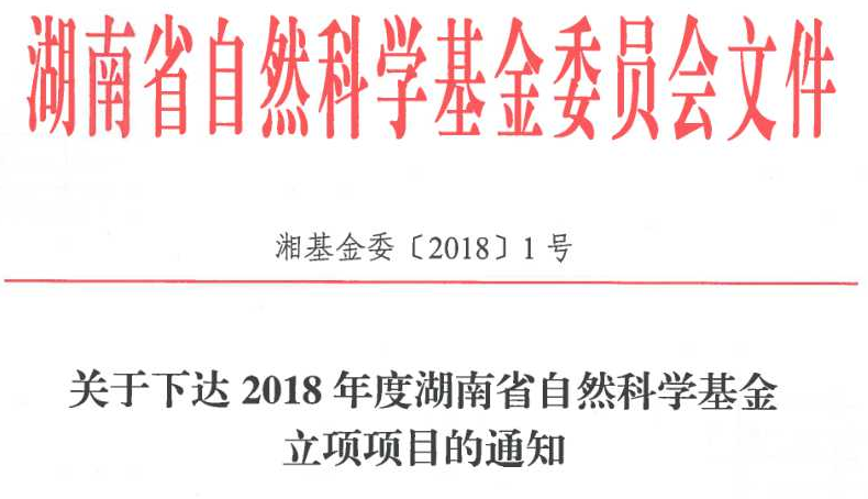 湘基金委[2018]1号_2018年度湖南省自然科学基金立项通知