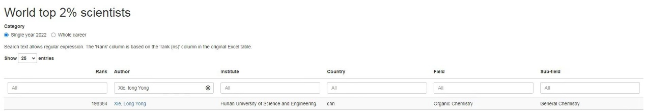 (本网讯 袁志辉) 近日,美国斯坦福大学发布了2023年度“全球前2%顶尖科学家榜单”(World's Top 2% Scientists 2023),我校化学与生物工程学院生物工程省级应用特色学科成员谢龙勇博士入选该榜单,进入所在学科综合影响力世界前2%。