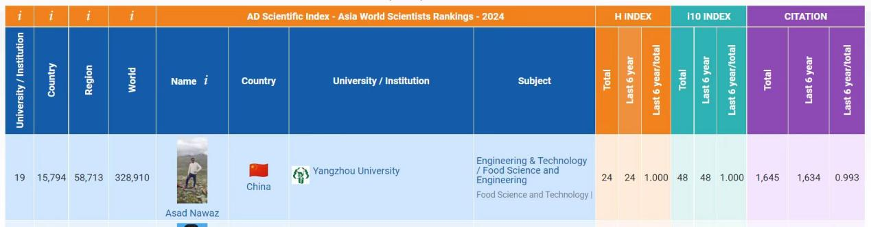 AD Scientific Index 2024发布最新排名,我校Asad Nawaz博士入选亚洲工程技术领域科学家排名,在中国排名15794位,亚洲地区58713位,全球328910位,H指数24,I10指数48,论文总引用数1645。全球前2%顶尖科学家榜单由斯坦福大学John P.A. Ioannidis教授团队与国际权威学术出版社Elsevier合作的项目成果,发布在Elsevier旗下的Mendeley Data网站上。榜单基于Scopus数据库的引用数据系统分析,对全球约700万科学家的论文引用数(区分自引和他引,提供自引数据)、H指数、合著者调整的HM因子、单独或第一作者的文章引用数等参数进行综合考量,涵盖文、理、工学科,收录来自22个学科领域、176个子学科领域全球排名前2%的科学家,能够更客观、更真实地反映科学家的产出量和学术影响力,为科学家长期科研表现提供了一个衡量指标。
