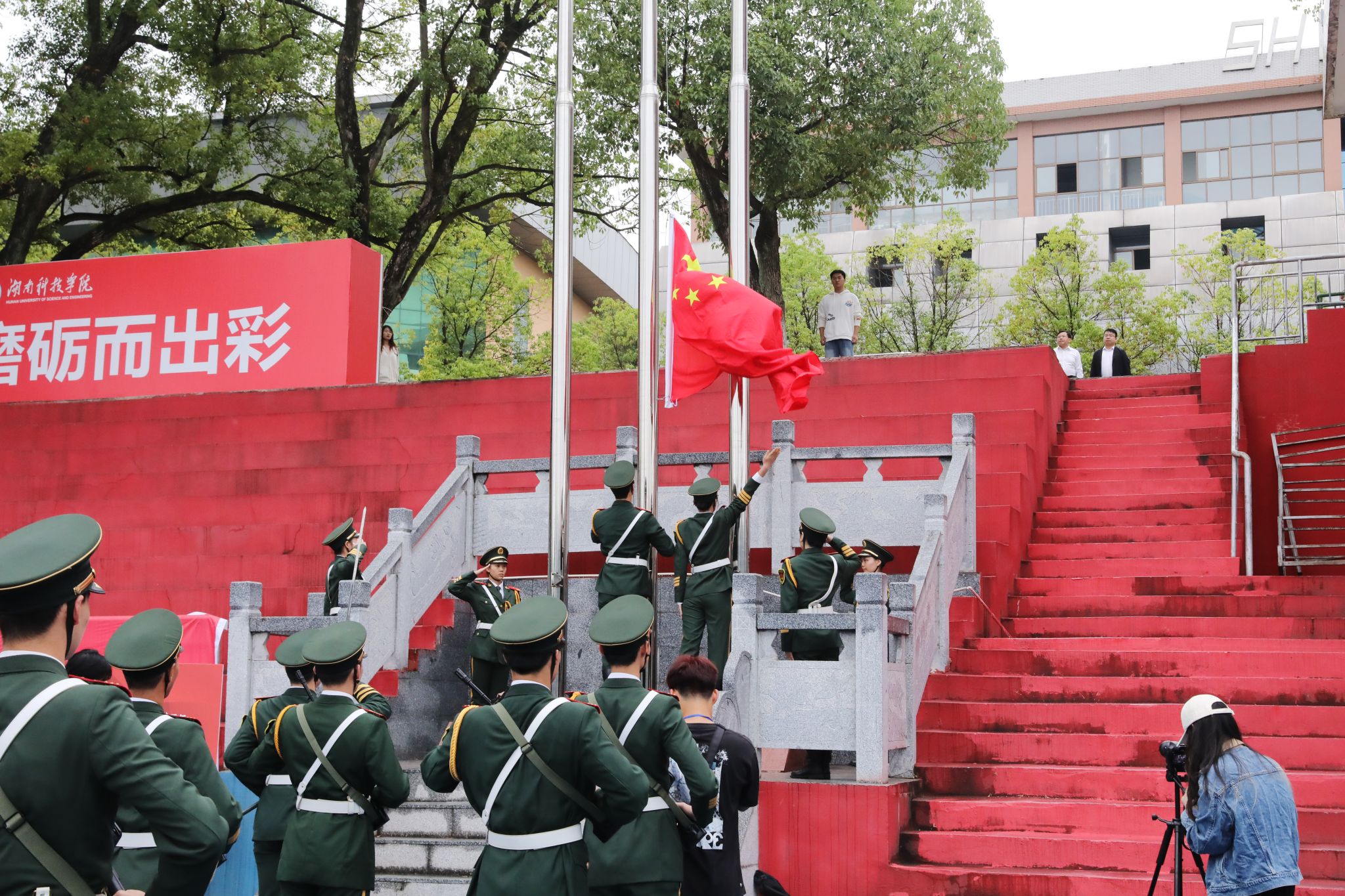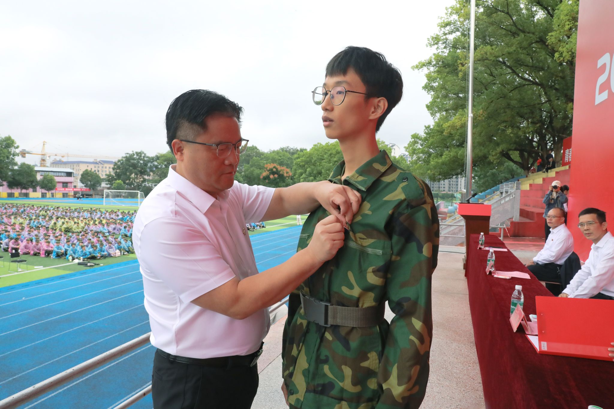 典礼上,李钢为2025级新生代表佩戴校徽。全体新生面向校旗庄严宣誓,正式成为“湘科院人”。