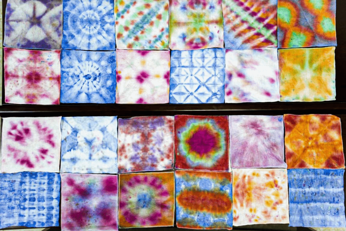 在非遗扎染体验课上,志愿者化身专业讲师,拆解扎染的经典技法,手把手教孩子们完成布料的折叠、捆扎、浸染等步骤。孩子们全心投入创作,收获了一件件图案独特的扎染作品。