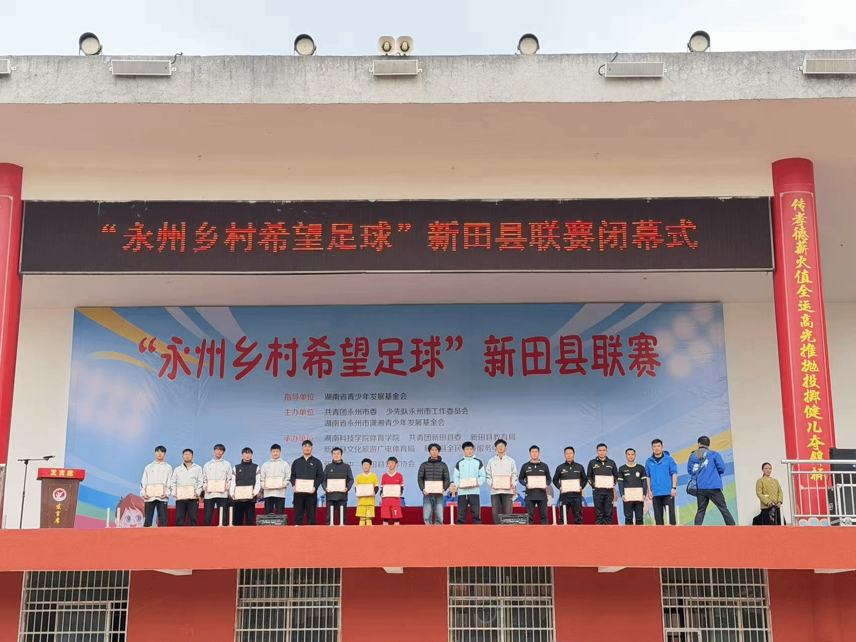 本网讯(通讯员 庄鸣)1月12日,由共青团永州市委主办、我校体育学院与新田县委联合承办的“永州乡村希望足球”公益项目新田县联赛,在新田县二中圆满闭幕。作为核心承办方,体育学院全程主导赛事筹备、教学指导等关键工作,为联赛顺利举办筑牢根基,搭建起乡村足球少年的成长舞台。