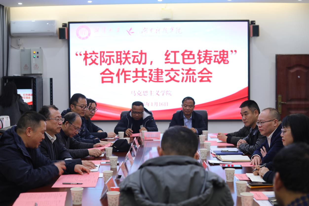 本网讯(通讯员 吴志伟)1月16日,湘潭大学马克思主义学院来我校开展合作共建交流。校党委委员、副校长何海及马克思主义学院领导班子成员、教师代表参加交流。