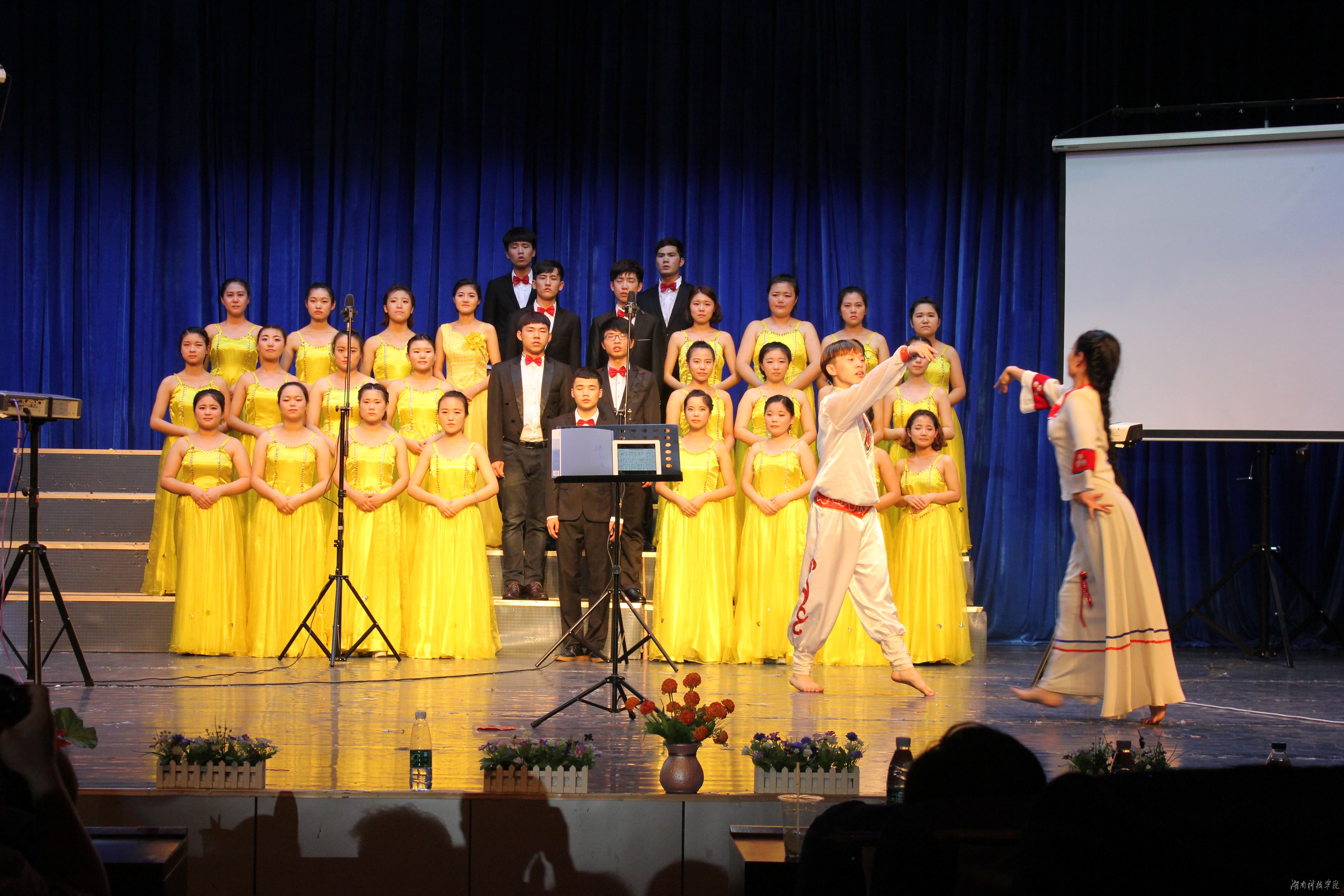 此次晚会由音乐与舞蹈学院1403班主办,校工会委员会、校团委协办,张向东和曹静两位老师主持。