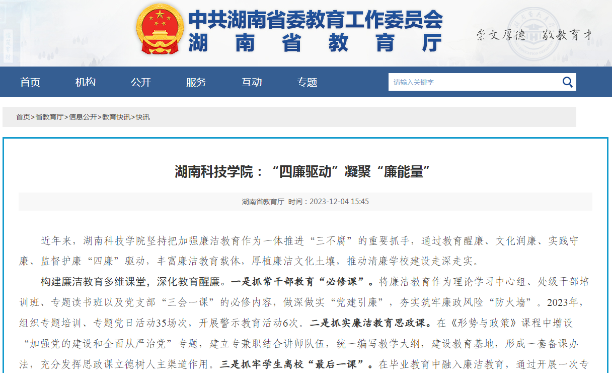 打造廉洁文化矩形阵地,深化文化润廉。一是融入校园环境。加强廉洁文化景观建设,美化了爱莲湖,兴建了廉洁文化长廊,设立了一批楼道廉洁文化宣传牌,让廉政文化景观“出门可见、随处有影”。二是融入校园文化。通过倡导《华体会官方版网站登录入口清廉公约》,推广使用电脑廉桌面,摆放岗位廉洁风险警示桌牌,定期开展廉洁微党课、廉洁作品创作、廉洁知识抢答赛等丰富多彩的廉洁文化进校园活动,以及在电子显示屏滚动开设“今日说廉”专栏,在“清廉湘科院”微信公众号发布微电影、小故事、廉洁寄语、漫画说纪等新媒体作品,让党员干部在“实景”“实境”中接受教育。三是融入地方资源。依托学校现有湖南省舜文化研究基地、濂溪学研究基地等平台,充分挖掘运用永州红色教育资源和地方优秀传统文化,立项省级以上廉洁教育研究课题2项,不断在传承地方文化中涵养清风正气。四是融入校地合作。与永州市纪委监委、永州市教育局共同探索推进大中小学廉洁教育一体化,组织专家团队为本地5000余名大中小学生宣讲周敦颐廉洁思想,实现廉洁教育资源共建共享。指导乡村振兴帮扶点江永县邑口村将清廉文化融入清廉村居建设,成功创建“永州市清廉乡村建设示范点”。