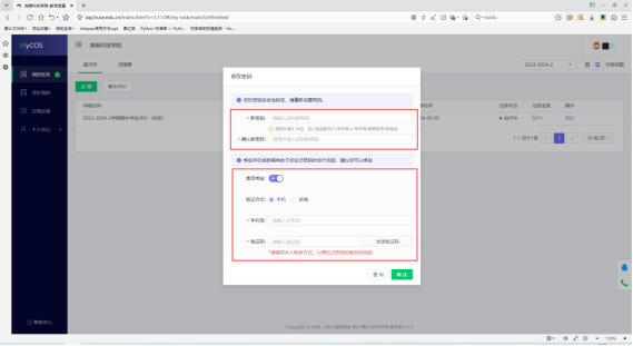 3.第一次登录后按系统提示修改密码,并请务必绑定手机和邮箱,以便忘记密码时找回,登录过程中账号密码如有问题请及时跟本学院教务老师联系。