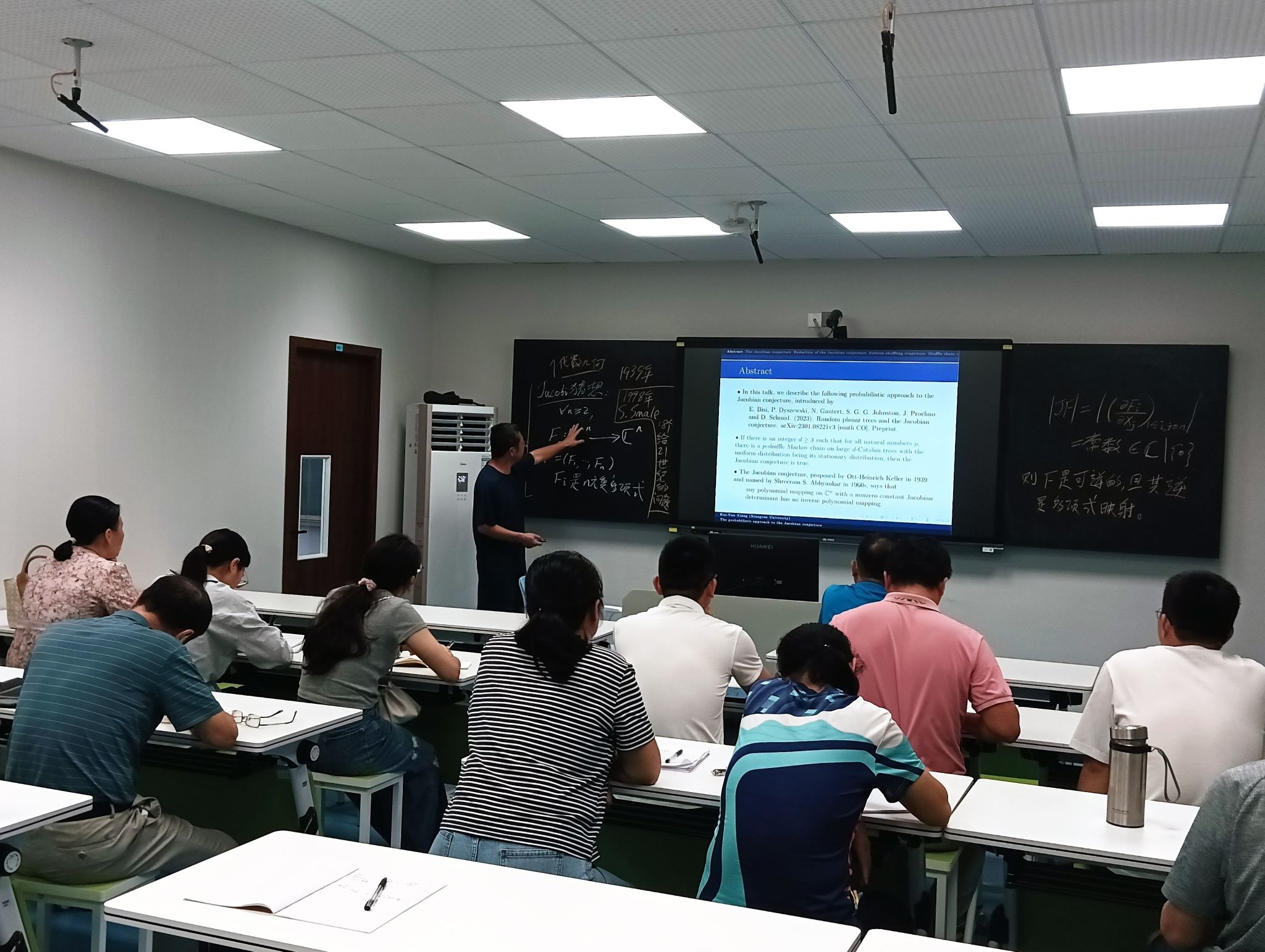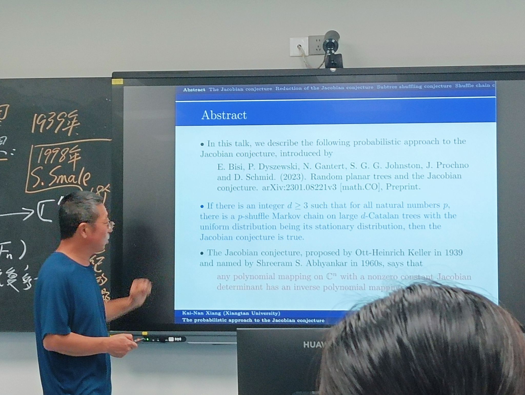报告中,向开南教授围绕E. BisiP. Dyszewski等学者于2023年提出的雅可比猜想概率方法展开阐述。该方法通过随机平面树与雅可比猜想建立联系,提出若存在整数使得所有自然数,都存在以均匀分布为平稳分布的大卡特兰树洗牌马尔可夫链,则雅可比猜想成立。同时,向开南教授还分享了团队在相关概率问题上的研究思考。