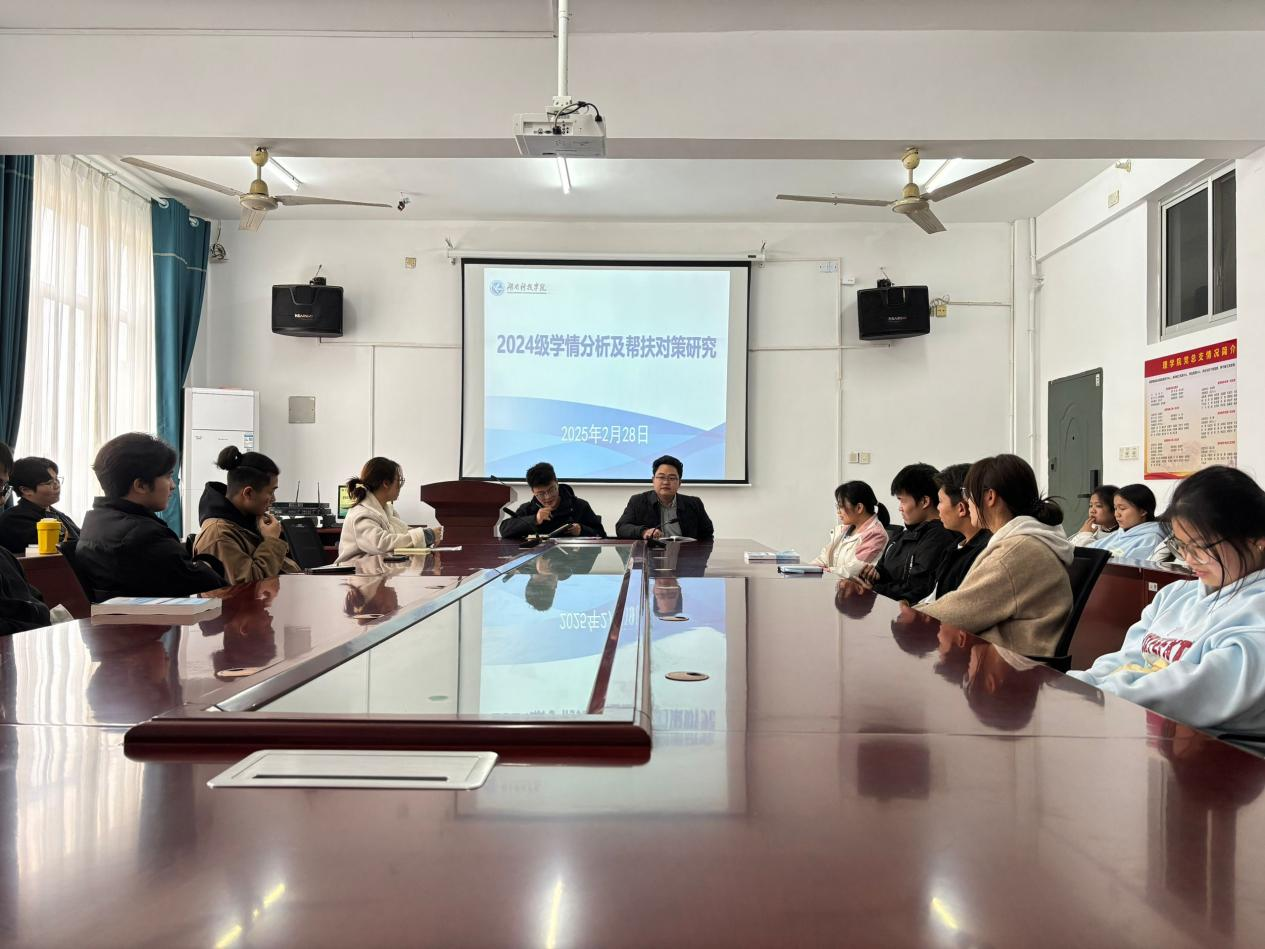 本网讯(通讯员 谢钢)2月28日中午,理学院在明理楼313召开学情分析及帮扶对策研究专题会议,学工办主任杜俊杰、2024级辅导员谢钢出席,各班班长、团支书、学习委员、心理委员参加。
