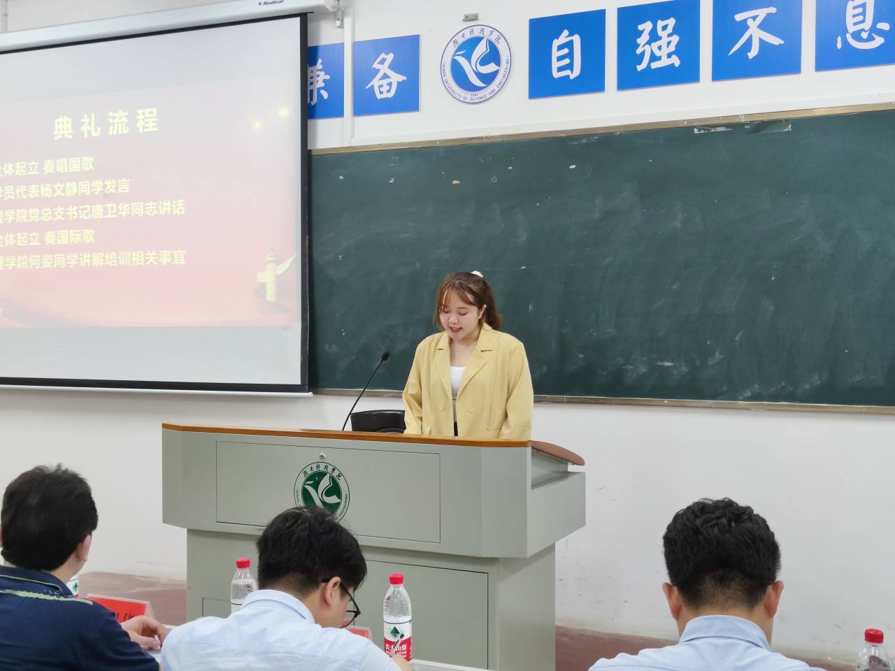 对入党积极分子进行培训,既是保证新发展对象质量,保持党的先进性和纯洁性的必要环节,也是帮助同学们了解党、深刻领会党员的义务和权利、树立共产主义信念的需要。本次分党校联合培训开班典礼以全体起立、奏唱国歌拉开序幕,学员代表思政2001班杨文静代表全体学员向党组织表态会积极认真地参与本次培训。今年是建党100周年,中国共产党人以初心为桨、借时代之舟、化使命为帆,砥砺前行。作为党的后备军,不仅要追求知识上的拓展,更要寻求思想上的进步;要秉为国奉献的坚定信念,做一只船桨,在时代发展的巨浪中犹能稳中有进;要肩负民族复兴之重任,与时代使命同行,与时代重任齐飞。