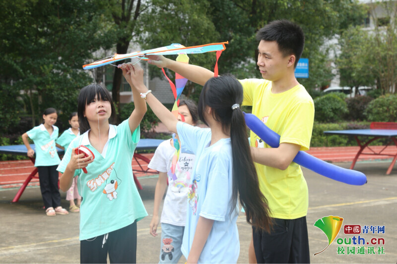 图为志愿者在指导学生放飞风筝。中国青年网通讯员 刘德江 摄