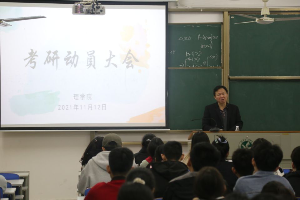 会上,唐院长作了动员讲话。在讲话中,唐院长分享了学院往届学生在考研路上的故事,提出了几点建议:一是选择报考学校和专业需斟酌,可请老师“把把脉”,尽量不扎堆;二是处理好考研与参加学科竞赛的关系,两者并不冲突,参加学科竞赛会提升考研竞争力;三是从自己的兴趣和就业意向出发,在保持数学优势的基础上,可以考虑跨专业报考;四是在对报考学校和专业对比时,要侧重考虑其师资队伍和科研成果情况。