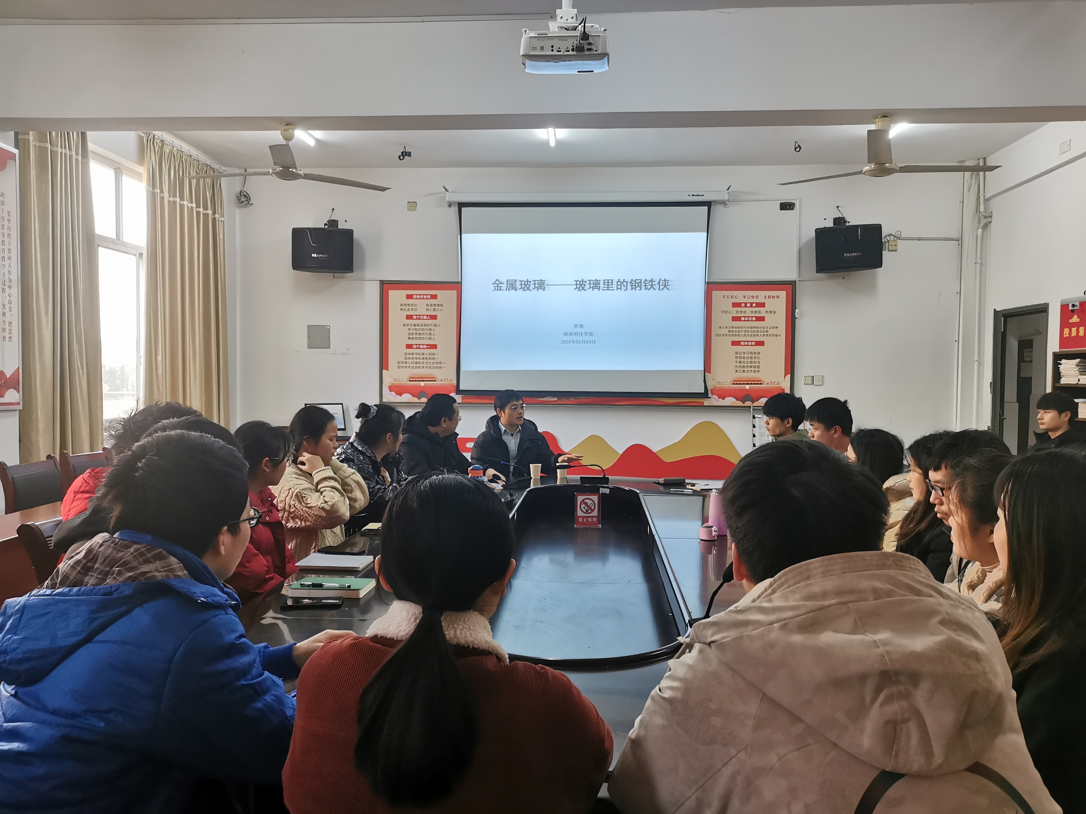 讲座上,贺强用通俗易懂的语言向同学们讲解了什么是金属玻璃以及金属玻璃和玻璃的区别,对于金属玻璃的研究从意义、优点、生活应用等方面进行了讲解,同时还分享了自己对学术研究的几点体会。