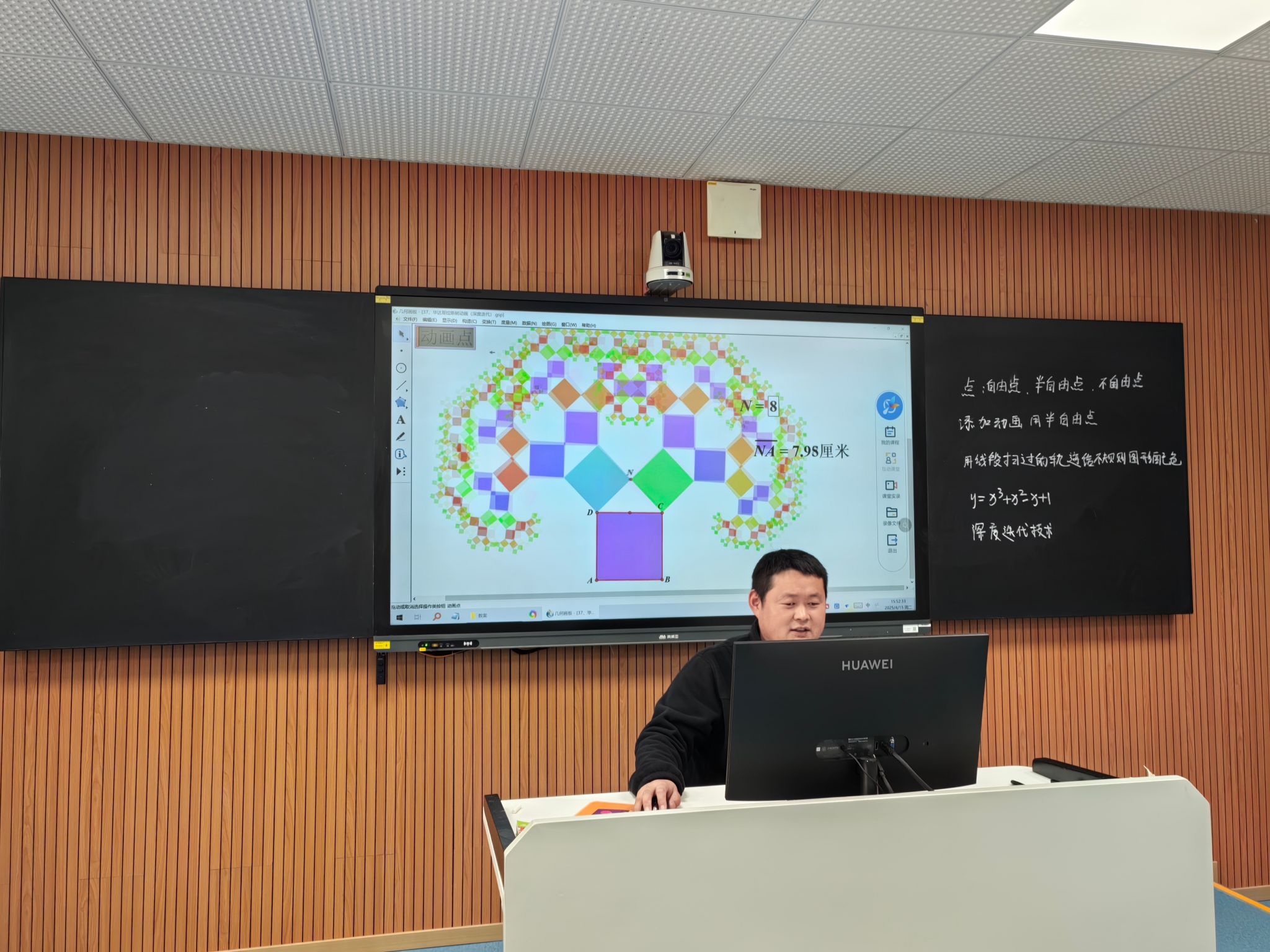 在报告中,孟磊老师用几何画板动态展示了中小学数学中常见的数学模型和中学物理中常见的一些物理模型;课堂上,孟老师现场制作了“动态毕达哥拉斯树”“转动的风车动画”等动画,讲解了几何画板的基本操作技巧。通过多媒体教学设备动态模拟,生动形象地将数学和物理中的抽象的问题直观展示,提高了教学效率,增加了课堂教学的趣味性。在报告的最后,孟磊老师还分享了他在几何画板课程教学中的应用案例,激发了在场老师的学习热情。