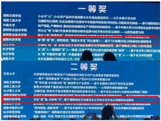 马克思主义学院参赛团队经过院赛推荐、校级初赛、培养打磨、模拟答辩、省级复赛,由陈猛、高丹、全伟老师指导的许圣翰、唐汇、左琛、邓怡、陈玲、靳卉珍、郭瑞、陈滢同学的作品——《破“脆”成“钢”,韧性锻造:“脆皮大学生”何以破局?——基于7大地理分区10所高校的调研思考》获一等奖;由符小勇、谷利民、吕雯老师指导的伍诗琪、邹恩雨、谢佳铌、田九余、龚欢、谭昕妍、吴逸凡、安贵邦同学的作品《文化“虚”途,乡韵有“方”:基于湘南地区文化虚无主义冲击乡村文化认同感的实证研究》获二等奖;由谢周艳、胡赟、刘晓慧老师指导的何永野、鲍德月、毛梦琦、唐颖、魏廷豪、奚玮甜、赵睿琪同学的作品《红色文化融入高校“五育”实践育人现状调研及创新模式构建——基于永州高校3500人调研分析》获三等奖。