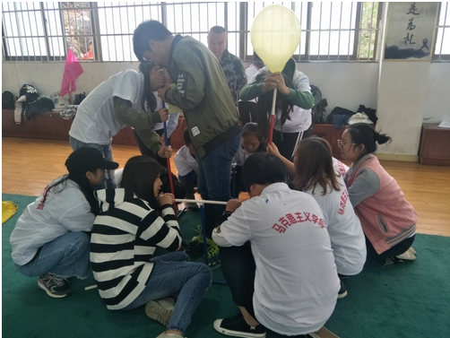 活动分为上下两场。以小组为单位,全体学生一共分为四组,每组都选有队长、队名、队歌和口号,并自制旗帜。活动设置了 “驿站传书、呼吸的力量、信任圈、穿越电网”四个有创意的环节。其中“呼吸的力量”环节不仅挑战了团队的协作能力,还让新生懂得了细心的重要性。“信任圈”环节,同学们围成圆圈,肩并着肩,坐到旁边同学的腿上,每位同学都承受着应有的重量,考验并且加强了同学之间的信任感。最后,“穿越电网”这一活动展现出了同学们的领袖职责和团队力量,培养了同学们的计划性和条理性。活动后,同学们百感交加,热泪盈眶,受益匪浅。