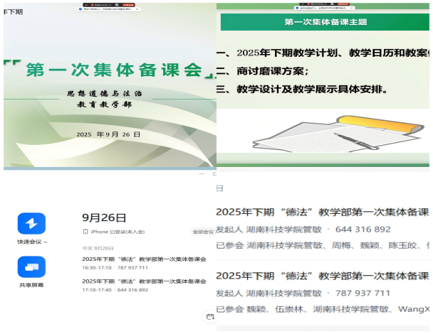 此次集体备课(磨课)活动中,各教研室同步记录教研精彩瞬间,生动呈现团队教研活力:中国近代史纲要教研室、马克思主义基本原理教研室、毛泽东思想和中国特色社会主义思想概论教研室、习近平新时代中国特色社会主义思想概论教研室的教师们齐聚线下会场,围绕教学内容热烈研讨、各抒己见,现场氛围浓厚;思想道德与法治教研室则结合教师工作安排,通过线上会议形式高效开展备课交流,确保教研工作“不掉线”、教学研讨“不降温”。