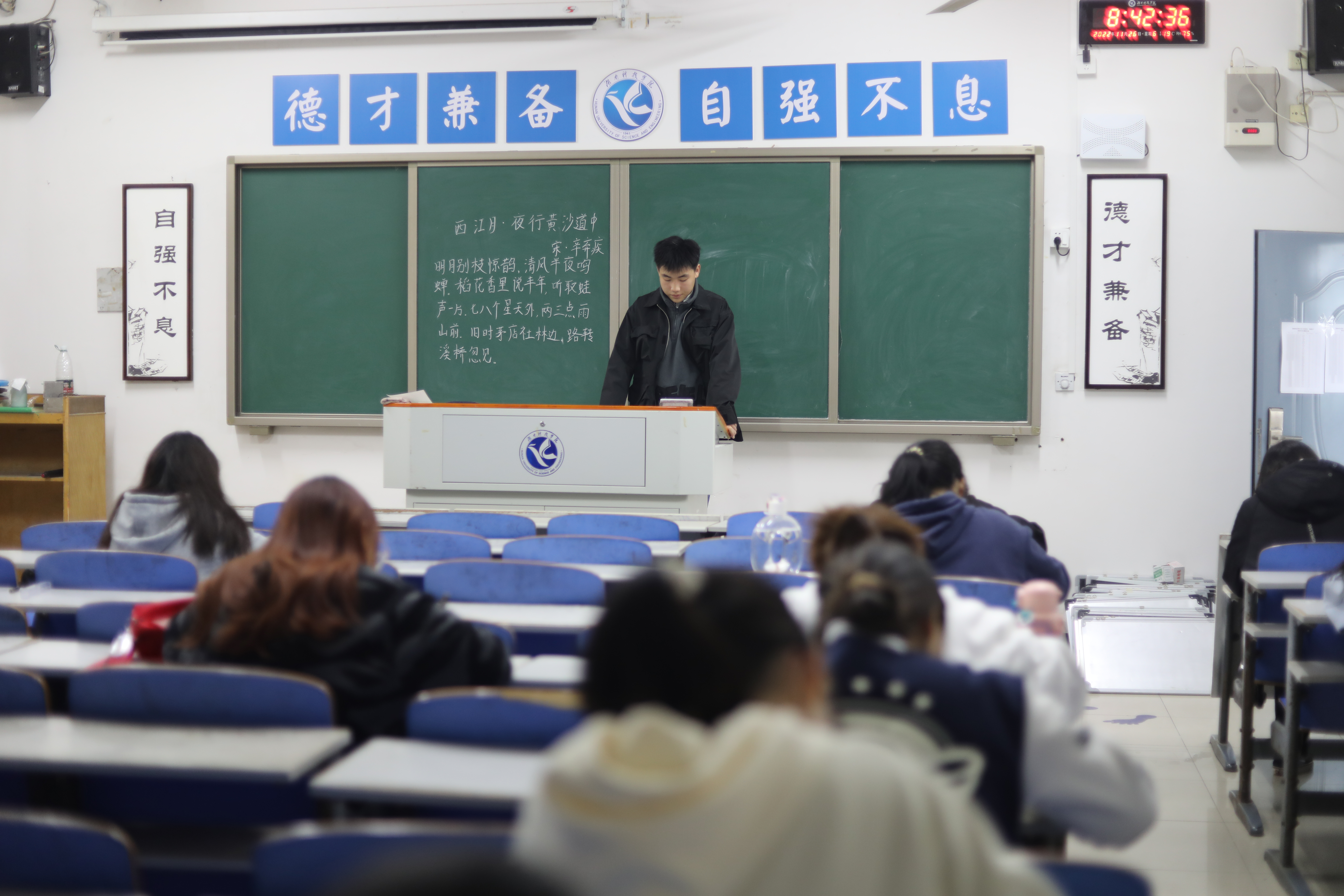 钢笔字书写以《西江月·夜行黄沙道中》为题,选手在书写时需注意卷面要美观大方,必须在规定时间内完成书写;粉笔字书写以《山行》作为比赛题目,要求选手书写时端正、规范,板书必须整洁、合理,章法匀称;毛笔字比赛以《淮上与友人别》为题,要求选手书写形神兼备,点画准确。可以看到,在本次大赛中,参赛选手的作品或游云惊龙、或仙露明珠、或群鸿戏海,于笔墨挥斥间书写少年意气,于行云流水中尽显科院风采。