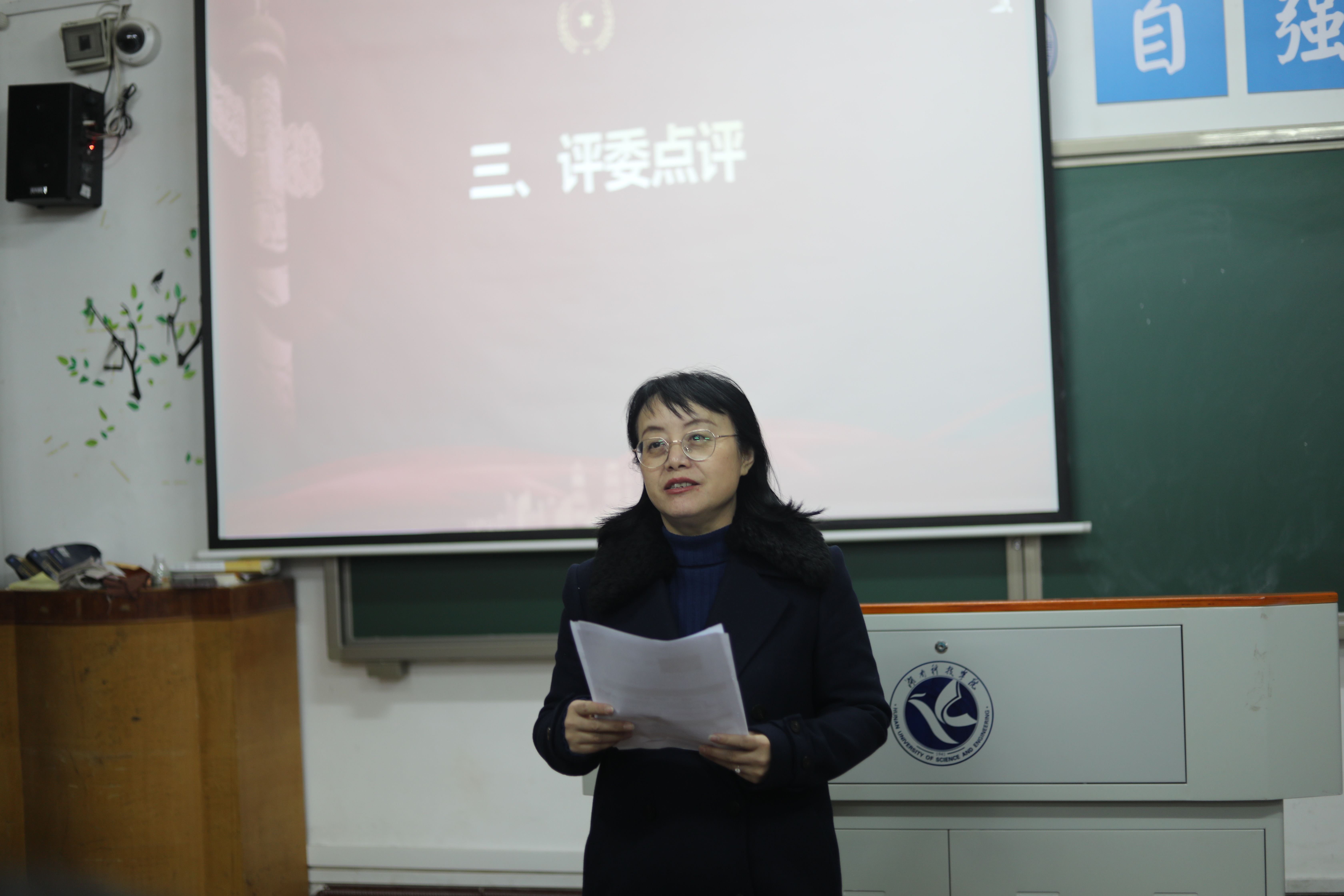 “你们站在讲台上的表现,让我感到惊喜、新鲜和饱满的热情,你们把一堂微课上得是那么的鲜活而富有情感,希望你们能继续保持这份热情投入到往后的教学事业中”。赛后,马克思主义学院院长廖雅琴老师充分肯定了本次参赛选手的能力和水平,高度赞扬了同学们精彩的表现力和教学中设计的小巧思,并针对教学选题和专业技能提出以下四点宝贵建议:第一,强调要将党的二十大精神融入课堂;第二,要善于把握微课特点来调节教学内容,从而更好地升华课堂教学;第三,教师素质表现力参差不齐,师范技能训练有待加强,特指出普通话需要勤加练习;第四,要注意细节和用语的准确性。
