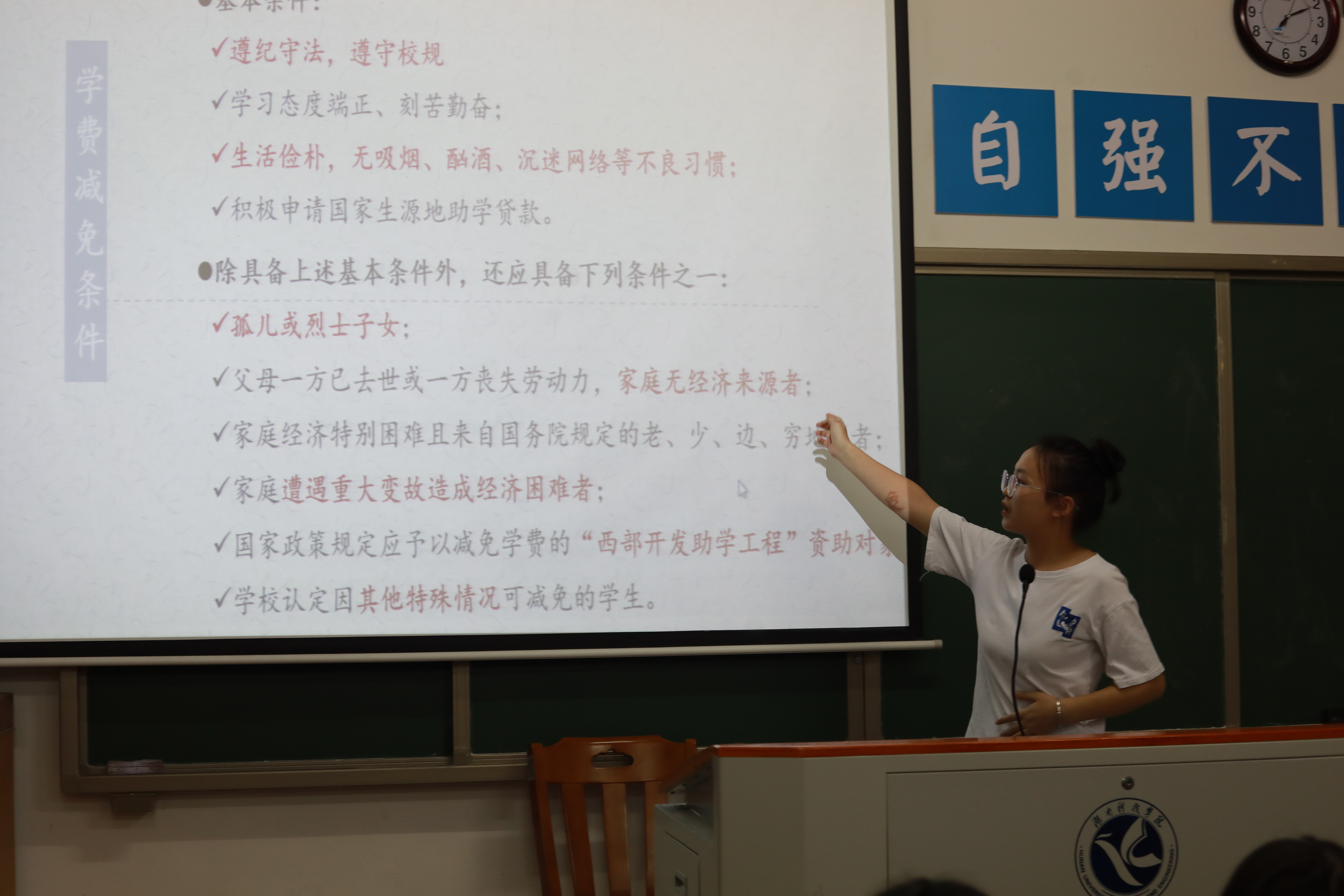 会上,刘晓倩对学校的学生资助政策及资助育人体系进行了全面宣讲。她向同学们解读了学院关于家庭经济困难学生的认定方法,介绍了国家奖、助学金的申报条件和评定方法、国家助学贷款的使用以及毕业到基层工作贷款补偿办法和服义务兵役学生学费补偿贷款补偿标准。