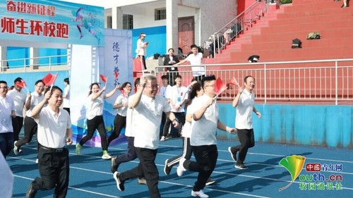 图为全体教职工从田径场起点出发。中国青年网通讯员 王慧宁 供图