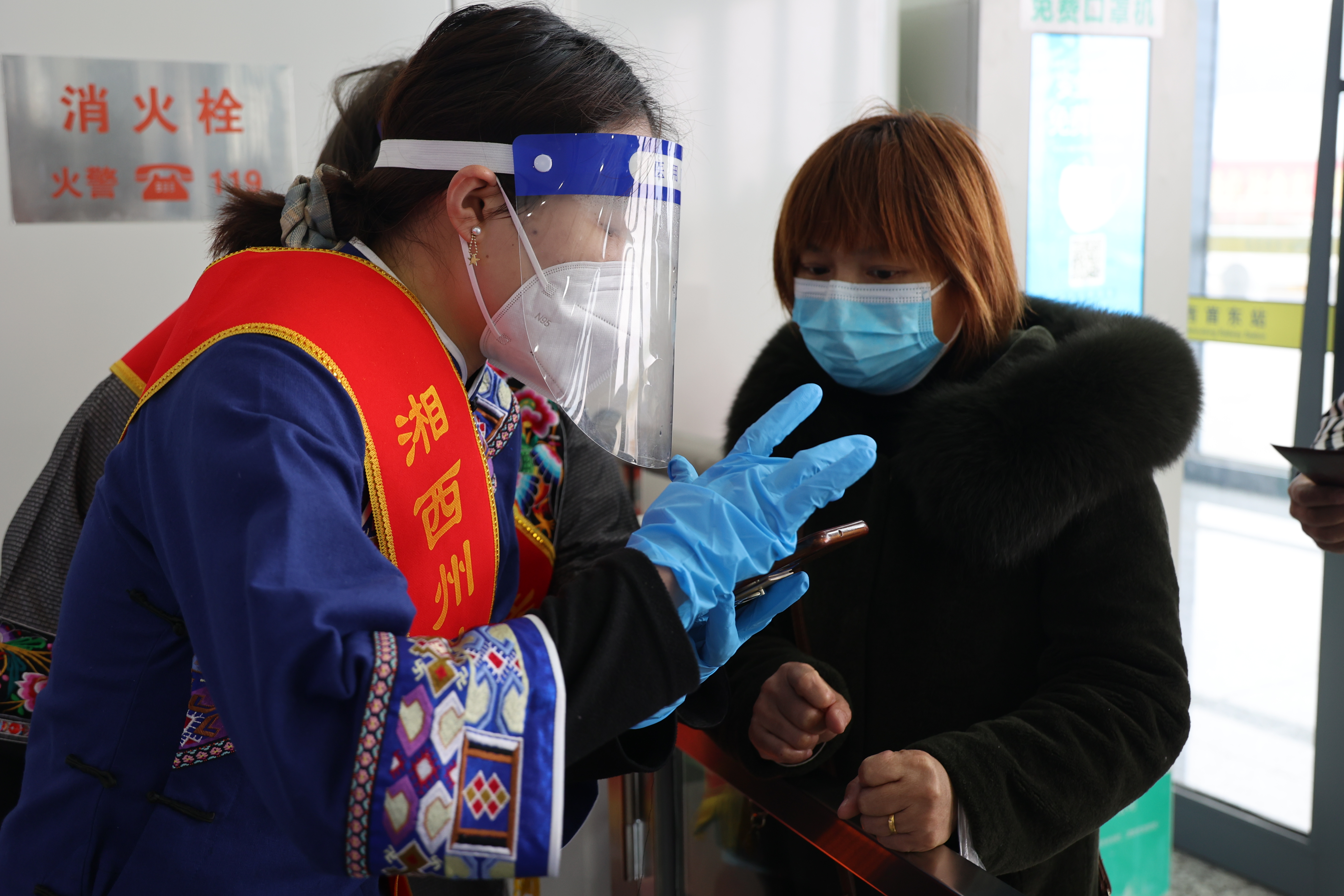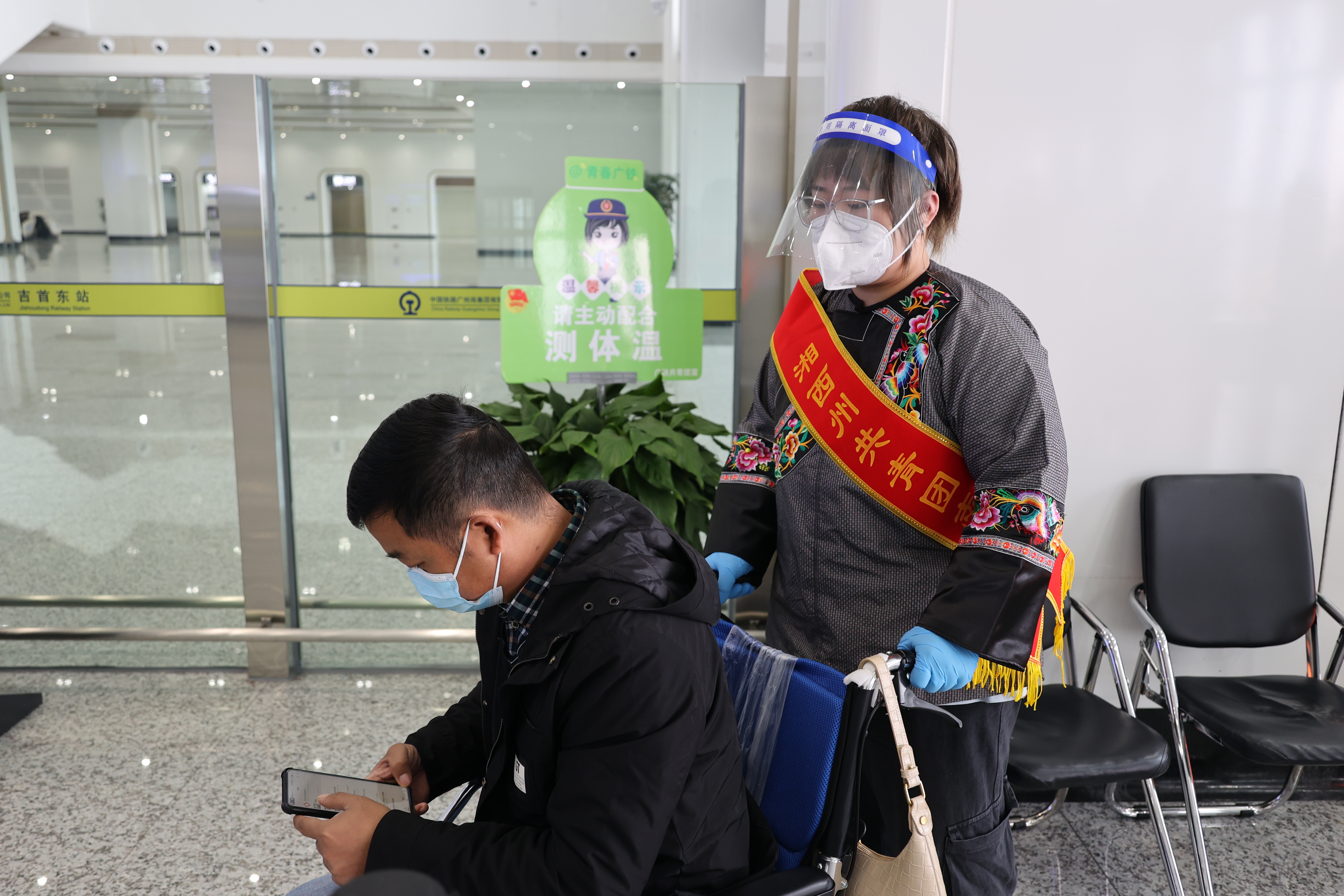 在湘西州州医院进行了核酸检测并参与培训后,志愿者于春运首日正式步入服务岗位,从上午9点至下午5点,两位志愿者每天穿上红马褂和手套,带上防护口罩和眼罩,在吉首市高铁站开展测量体温、查验两码、乘车引导、维护秩序、帮扶特殊群众等多项志愿服务。