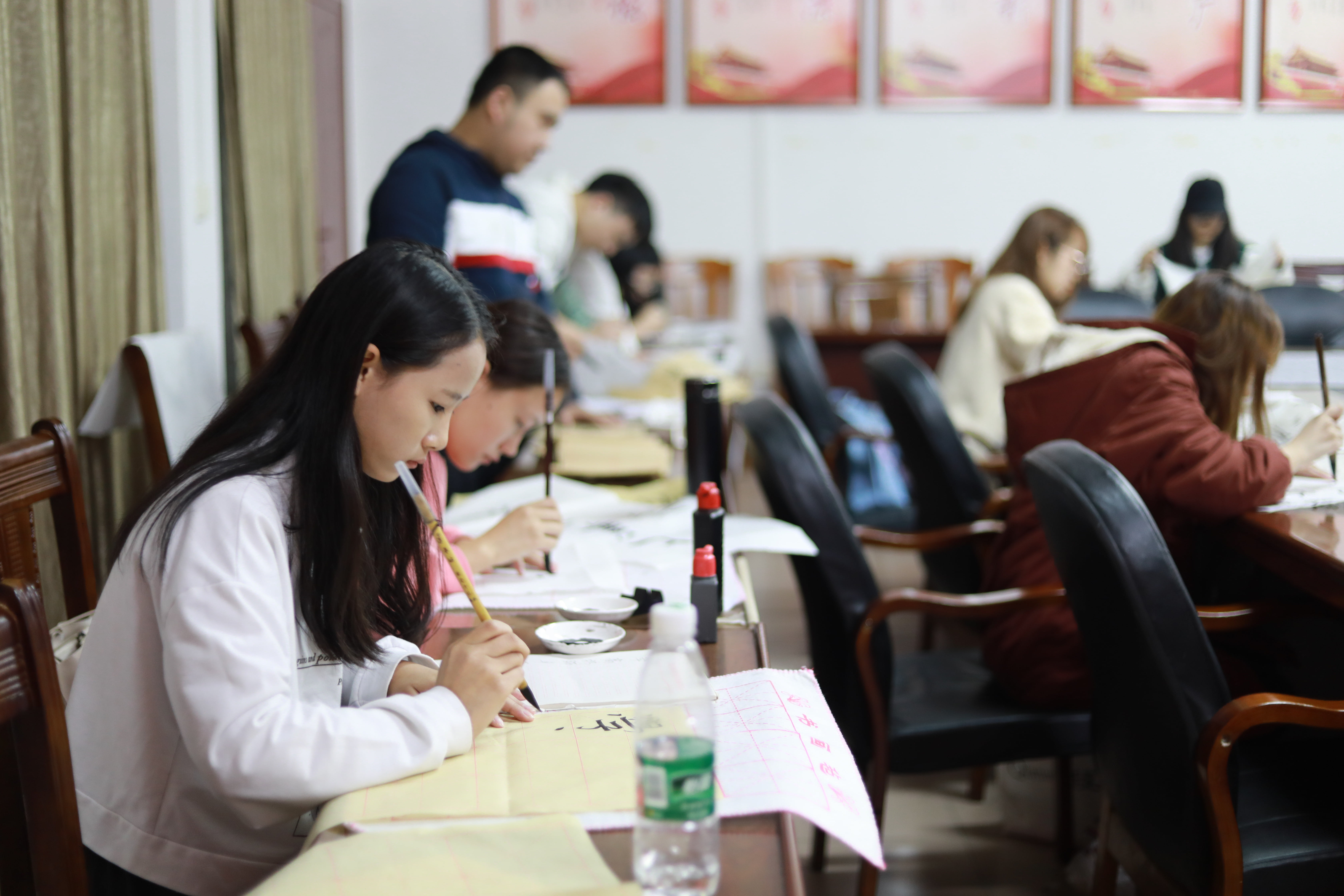 来到毛笔字的书写现场,宣纸在桌面铺开,香墨渐渐研开。手执一支毛笔,在行云流水间,不少同学都在挥洒属于自己的风采。