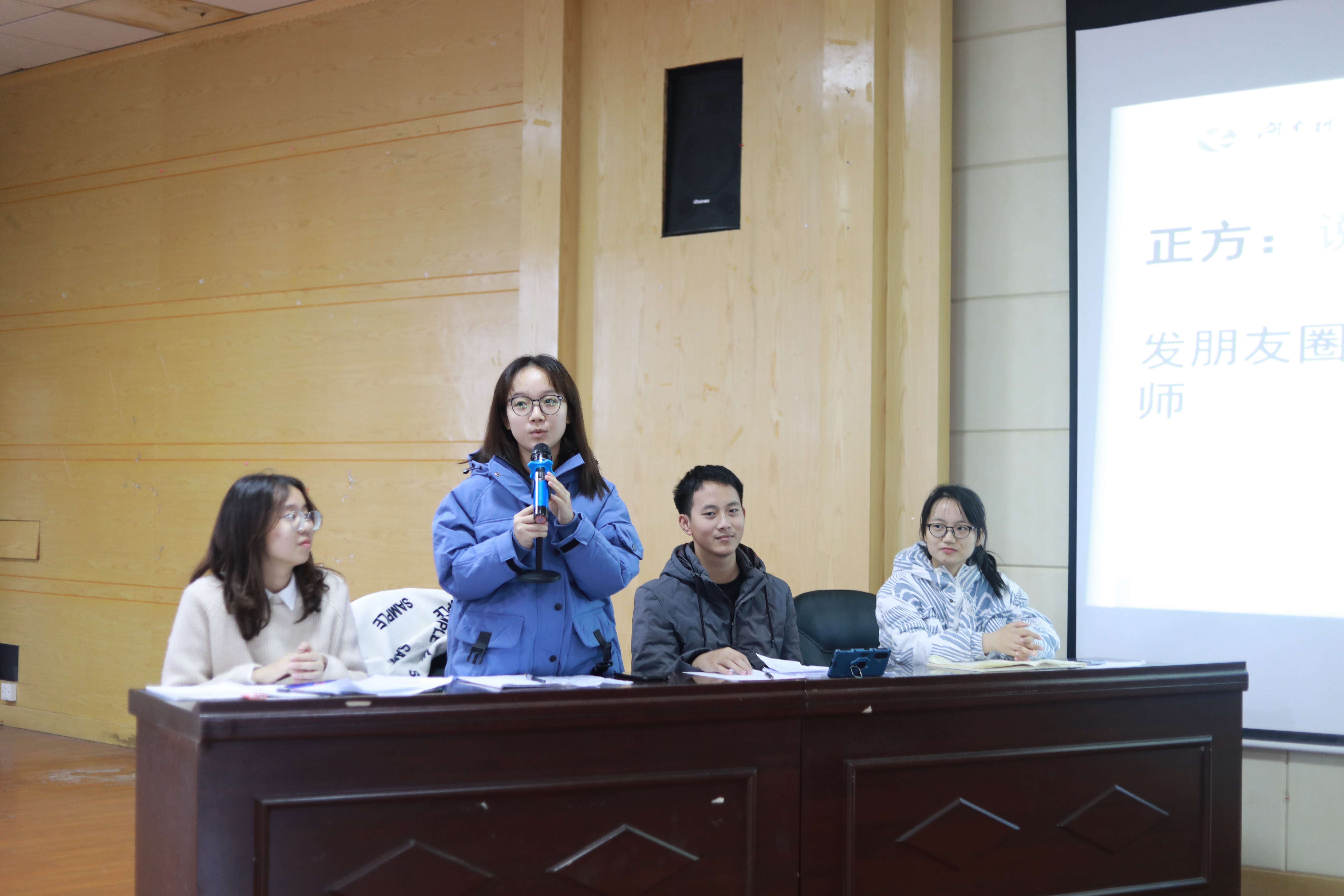 在最激动人心的自由辩论环节中,正方从多个层面分析朋友圈不屏蔽老师的好处,反方则以“不打扰也是一种尊重”观点进行辩论。反方四辩更是提出“朋友圈是我们生活的树洞”观点,力破对手防御,夺得本次辩论赛的冠军。