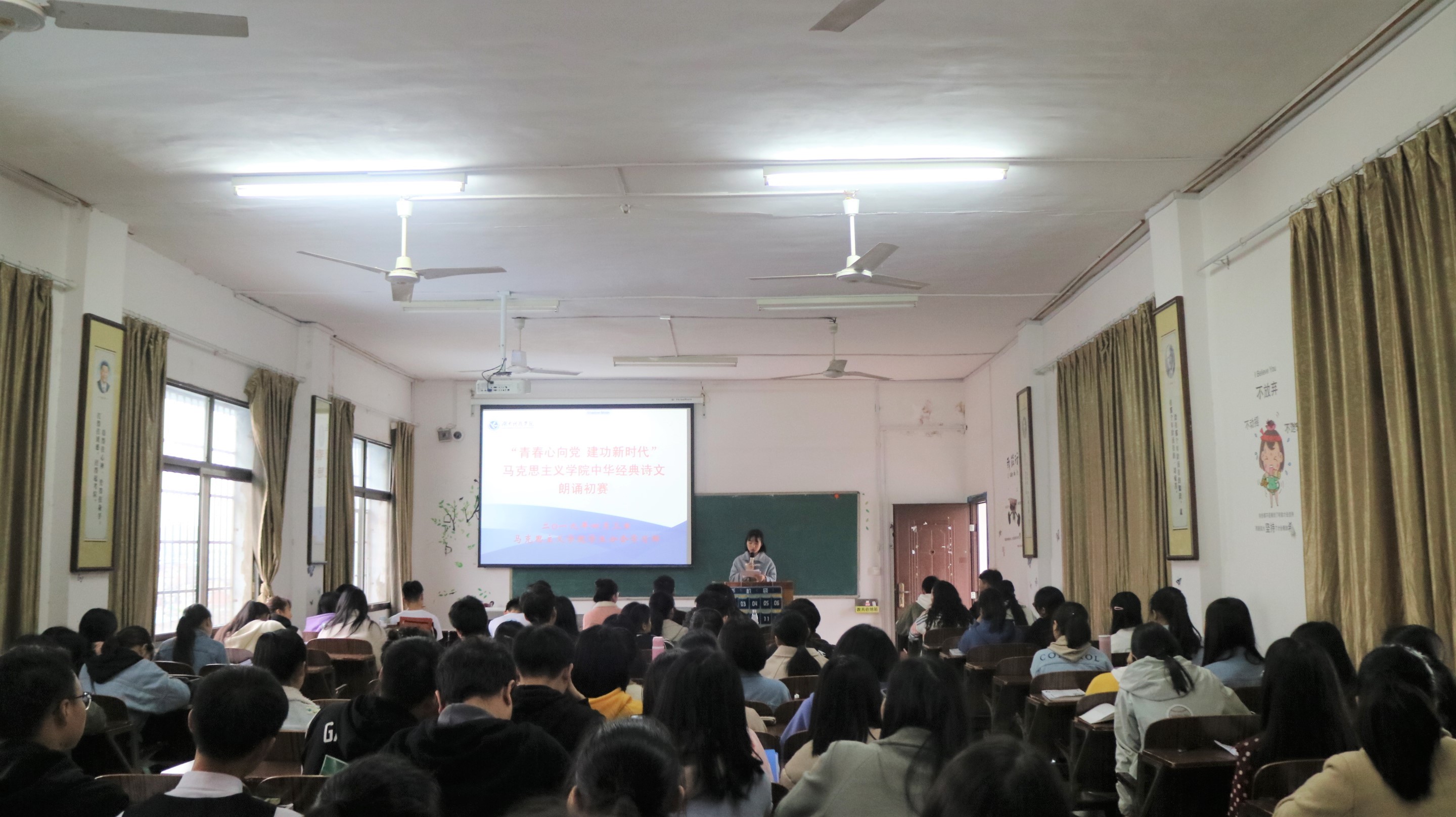 本网讯(通讯员 尹玉婷)为弘扬祖国优秀的传统文化,提升广大学生文化道德修养。4月3日下午,马克思主义学院 “青春心向党,建功新时代”朗诵比赛在鹤鸣楼501举行。