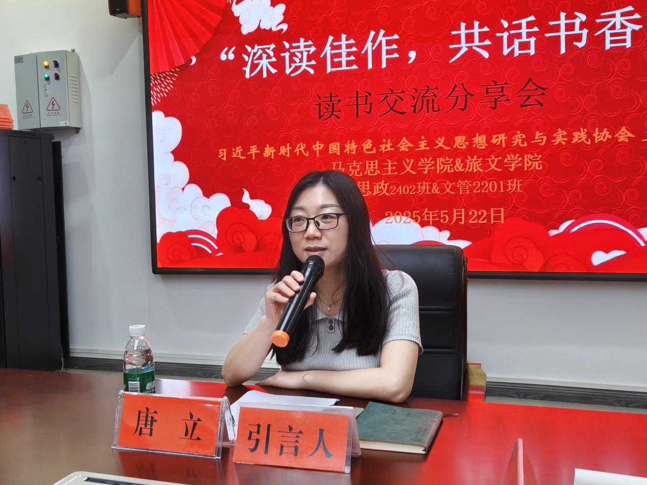 本网讯(记者 刘获逞 周聪)为响应二十届三中全会提出的“深化教育综合改革”目标,落实教育部《新文科建设宣言》倡导的“文科教育创新发展”要求,由马克思主义学院与旅游与文化学院两院学子合办,习近平新时代中国特色社会主义思想研究与实践协会承办的“新时代思想交流读书分享会”,于5月22日在鹤鸣楼405会议室举办。活动特邀马克思主义学院副院长唐立博士担任引言人,旅游与文化学院航管系主任黄萌博士和习研会指导老师邓昱全博士担任点评人,思政2402班同学与文管2302班同学作为分享人参与其中。这是习研会系列读书会活动举办以来的第一场跨院系读书会,也是校内少有的跨院系交流方式,尝试用不同学科领域碰撞出新时代新文科的思想火花。