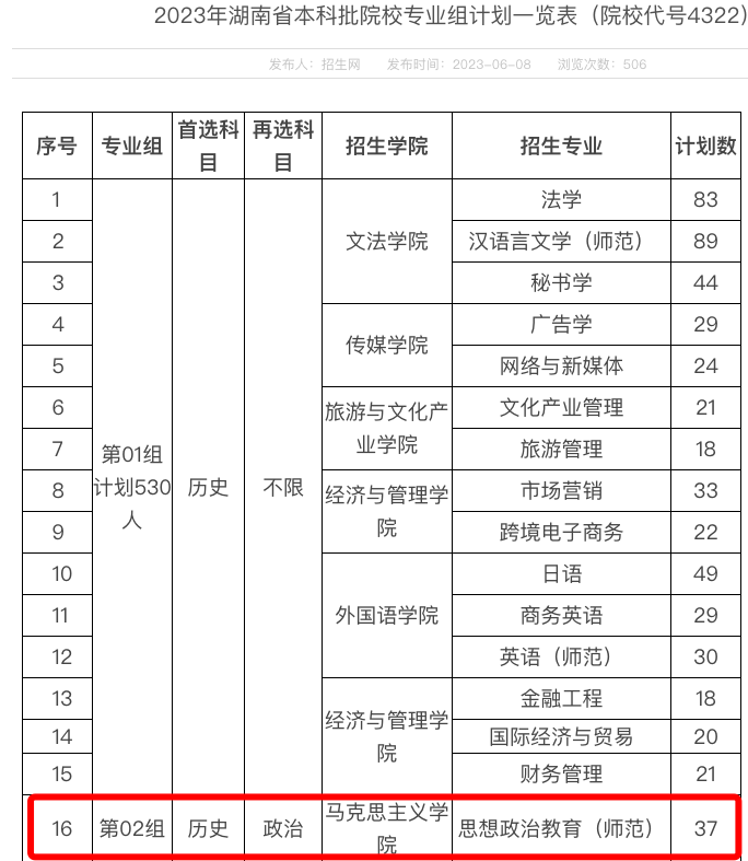 2023年湖南省本科批院校专业组计划如下