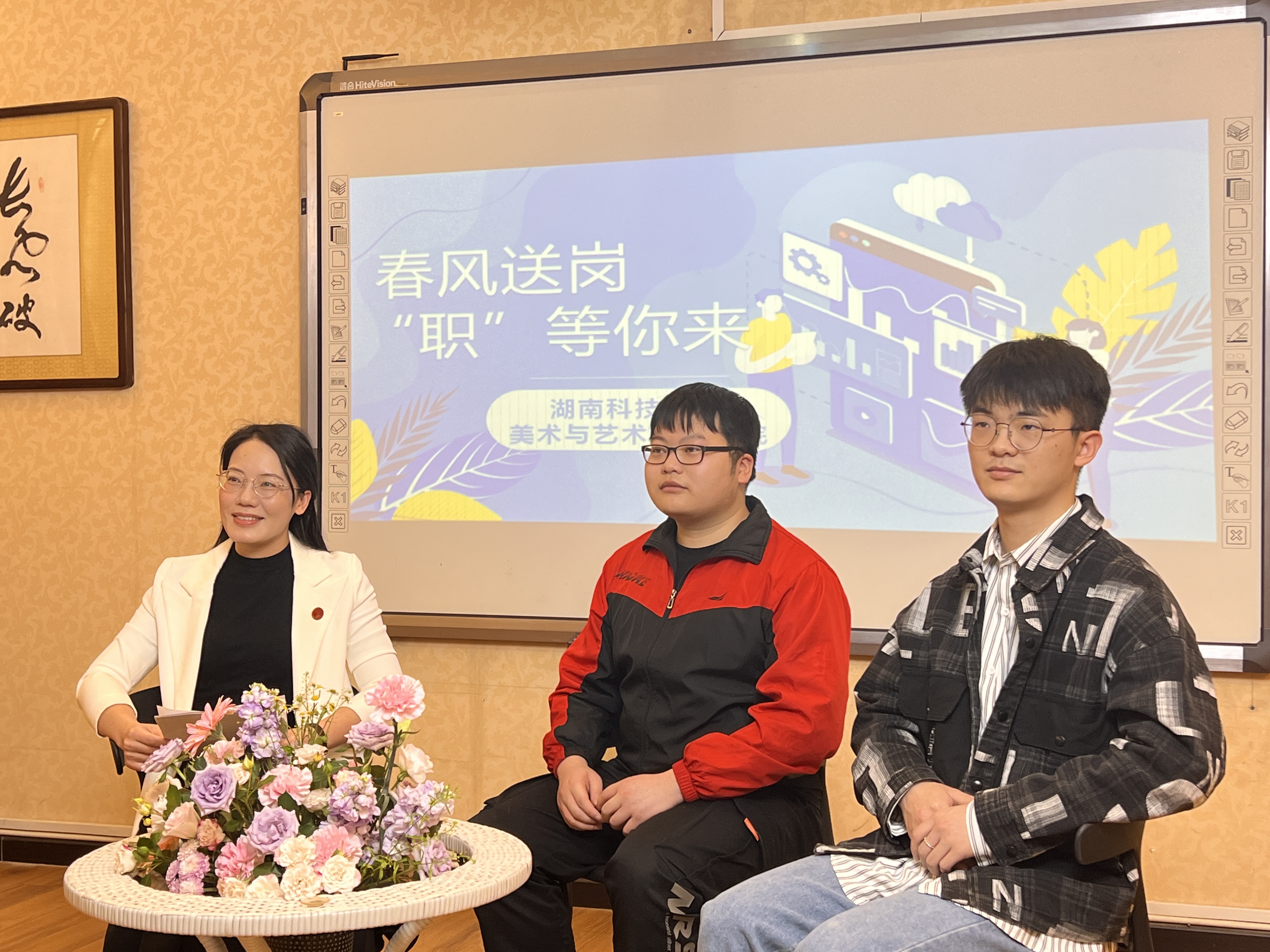 本网讯(通讯员 卿可青)2022年4月14日上午10时30分,华体会官方版网站登录入口美术与艺术设计学院联合6家优秀校友企业在南楼202举行“春风送岗·‘职’等你来”线上直播招聘会。本次招聘会现场由美院党总支书记刘华主持,6名毕业生代表参与互动,线上有150余名学生进行观看。