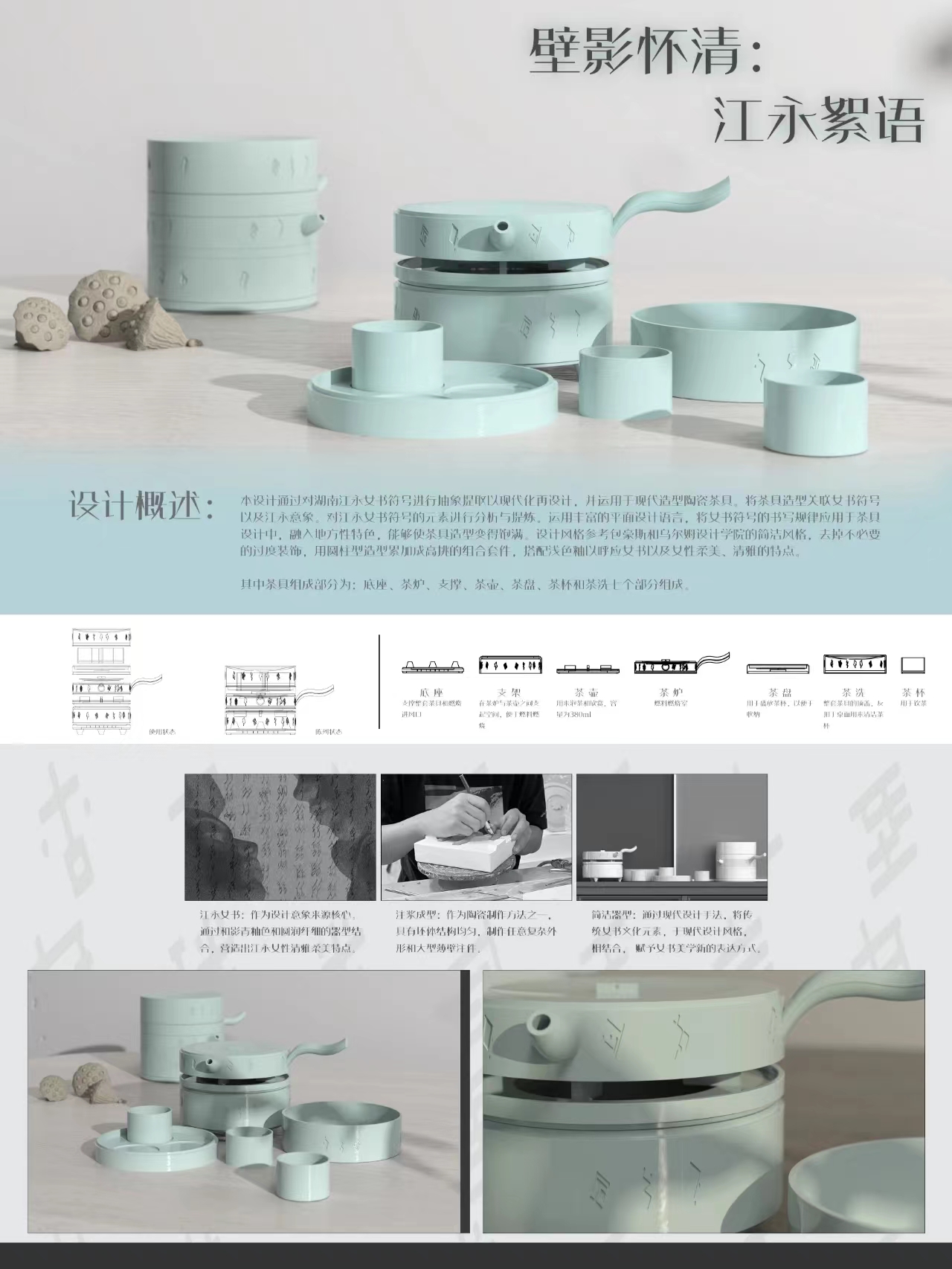 作品说明:该设计通过对江永女书符号进行抽象提取并加以现代化再设计,将茶具造型关联女书符号以及江永意象。