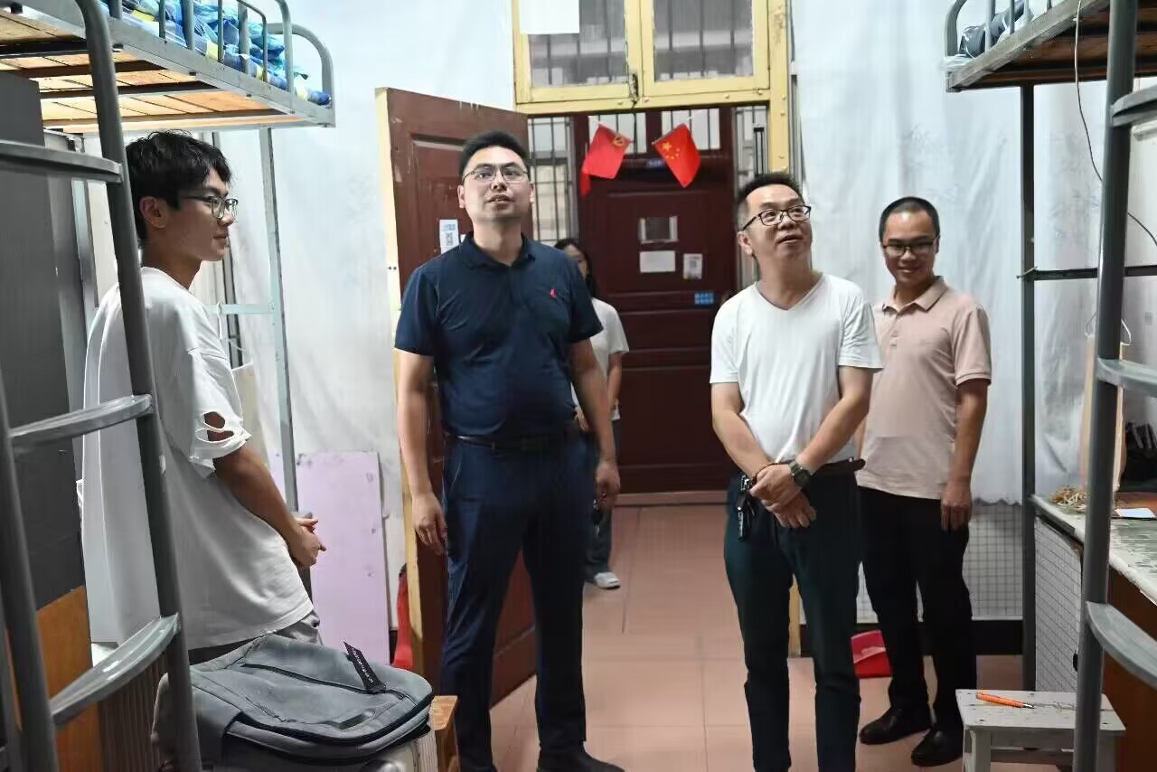 本网讯 9月10日晚,美术与艺术设计学院院长张建利、党总支书记王博、党总支副书记林乔军、副院长柏小剑、2023级辅导员唐天田及班主任深入寝室看望2023级全体新生。