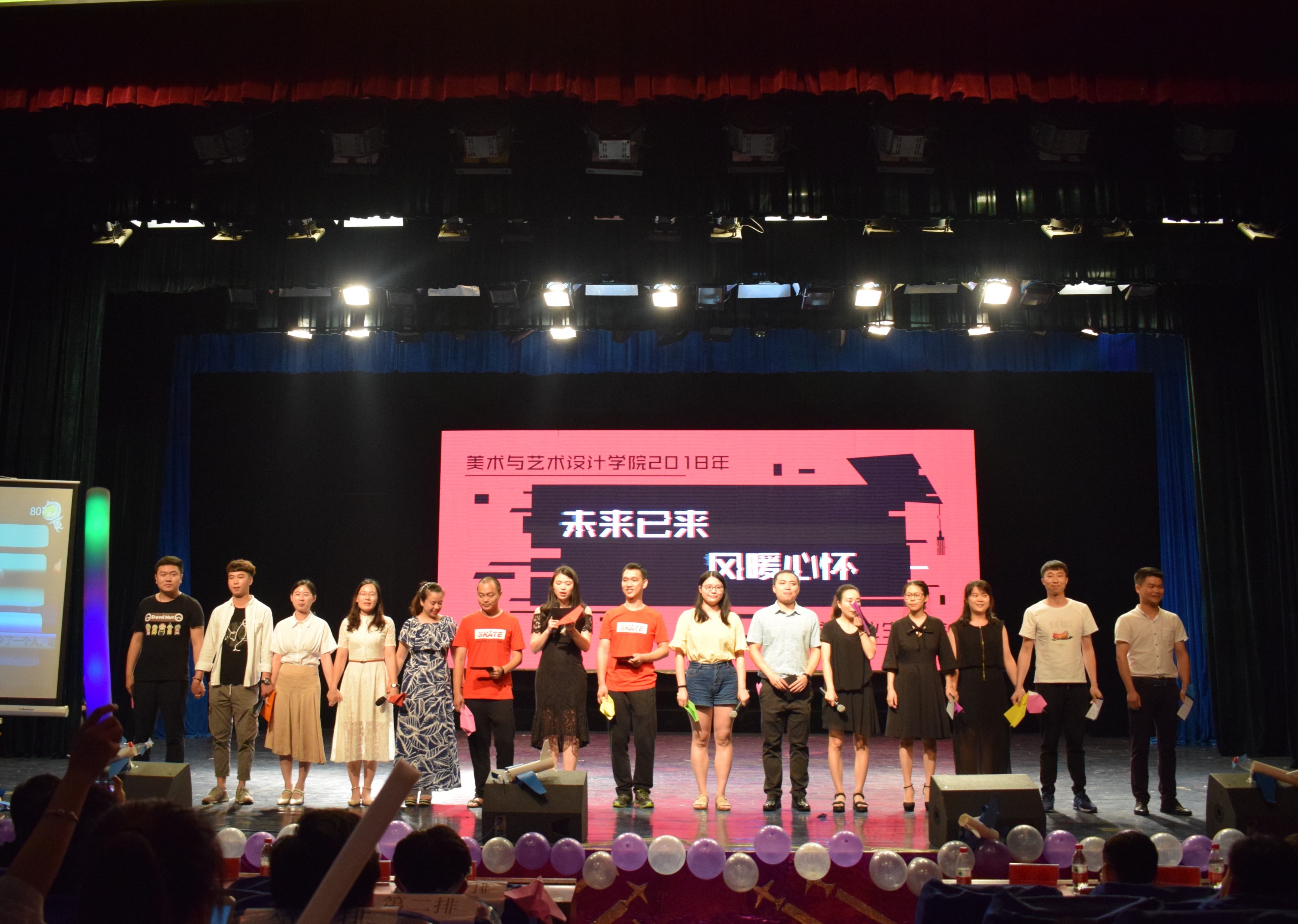 晚会伊始,老师寄语在舞台LED大屏幕上播放,毕业生照片回忆录在舞台两侧投影墙上滚动播放,学长学姐或俏皮或严肃的照片充满了这四年的点滴回忆。在视觉1602和美术1603班带来的舞蹈剧《陪我度过漫长岁月》中火爆开场,现场弥漫着欢乐的气氛。接踵而至的吉他弹唱、舞蹈、男生独唱、歌曲串烧、诗歌朗诵等节目彰显艺术色彩。回望尽头留下青葱岁月,展望前方不尽似水流年,吉他弹唱《那些花儿》勾起了大家对大学生活的无尽回忆,在吉他伴奏下,毕业生们深情地倾诉着对母校和学院的眷恋不舍之情。老师们的合唱《苔》把整台晚会推向高潮,老师唱出不仅是一首歌,更是唱出见证同学们四年的成长和经历,为同学们在大学生活里划下一个完美的句号。在2018届各班班长点名达到和全体毕业生寄语之后,毕业生们与老师一起合唱《朋友》,成为了晚会现场最有温度的一幕。小品《毕业三结义》和《大学毕业难》也是由毕业生所进行表演,在欢笑中纪念大学这匆匆四年的校园生活。