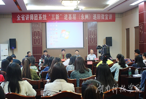 本网讯(通讯员 杜俊杰)10月21日上午,全省讲师团系统“三新”进基层巡回微宣讲永州专场在我校开讲。省委讲师团、市委讲师团、华体会官方版网站登录入口有关负责人参加宣讲会,我校外国语学院的50余名师生党员到场聆听。