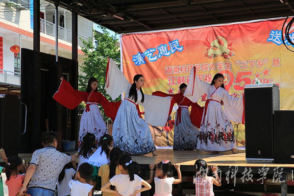 7月7日,该院与双牌县文体广新局、江村镇人民政府共同举办了华体会官方版网站登录入口大学生“三下乡”暨江村镇庆祝建党九十五周年文艺演出。此次演出内容丰富,形式多样。歌曲《美在永州》,唱出了永州人民的心声;轻盈灵动的瑶舞与富有异域风情的印度舞,彰显了不同地域文化的特色与活力。其中,双牌县文体广新局副局长刘兴国原创的歌曲《湘恋》和文化馆声乐专干唐红梅演唱的歌曲《欢天喜地》,分别表达了对家乡深沉的依恋和对美好生活的向往;《大渡河畔英雄多》情景剧突出主题,真实地还原了红军十八勇士强渡大渡河的英雄事迹……新颖与经典相融,受到当地群众的欢迎。