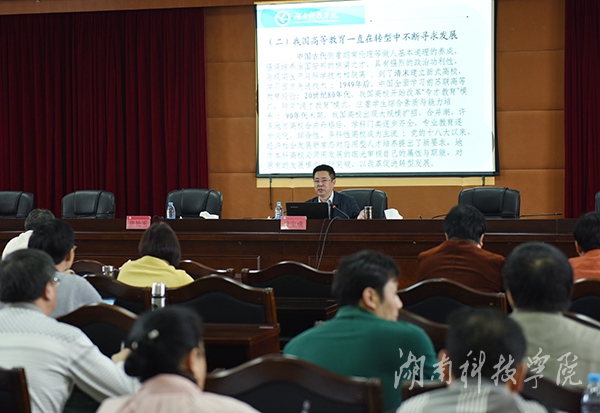 曾宝成从地方本科高校为什么要转型发展、地方本科高校转型发展的内涵诠释、地方本科高校转型发展的原则、当前我校转型发展的主要任务四个方面进行了阐述。