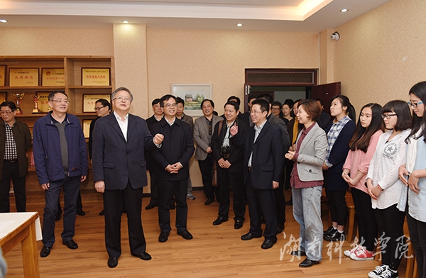 本网讯(记者 张云芳 摄影 何帅文)4月7日下午,省政协副主席欧阳斌、省政协文史学习委员会主任张智军等一行在永州市政协主席唐定、市政府副市长刘尤碧等领导的陪同下莅临我校,考察了电子与信息工程学院创新创业中心、外国语学院菁菁书院、美术与艺术设计学院大学生创新训练中心、图书馆、音乐楼、体育馆。校领导陈弘、曾宝成、宋宏福、郑山明、李常健、程智开陪同调研。