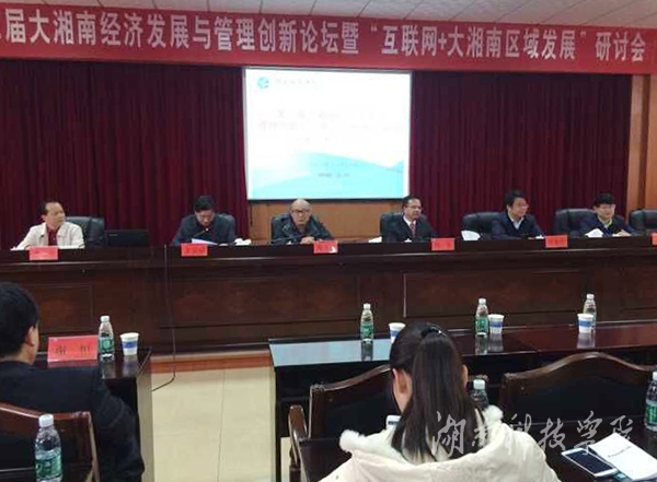 本网讯(记者 裴滢 实习记者 刘梦雅 张云芳 邓肖华 肖浪 尹文怡)11月14日,第二届大湘南经济发展与管理创新论坛暨“互联网+大湘南区域发展”研讨会在我校举行。校党委书记陈弘出席并致辞,副校长宋宏福主持。共有来自各高校30余名专家学者及企业家代表参加研讨。