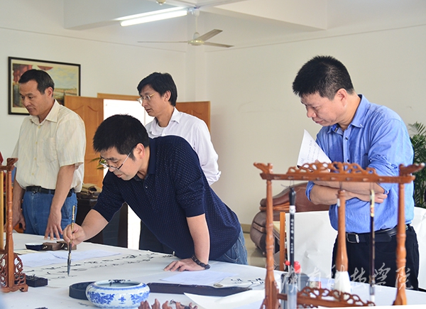 省书法家协会理事兼永州市书法家协会主席唐朝晖、中国美术家协会会员兼永州市美术家协会主席、原美术与艺术设计学院院长杨球旺、省书法家协会理事欧阳维忠、市书法家协会副主席陈刚、张玉波、宋运清、唐幼铎及书法家唐彦、周昌俊,我院美术与艺术设计学院周飞战、高双洋,以及爱好书法与绘画的文人墨客30多位前来参加此次活动,此次所创作的72幅佳作将由我校图书馆进行装裱、珍藏,以进一步营造图书馆浓郁的文化氛围。