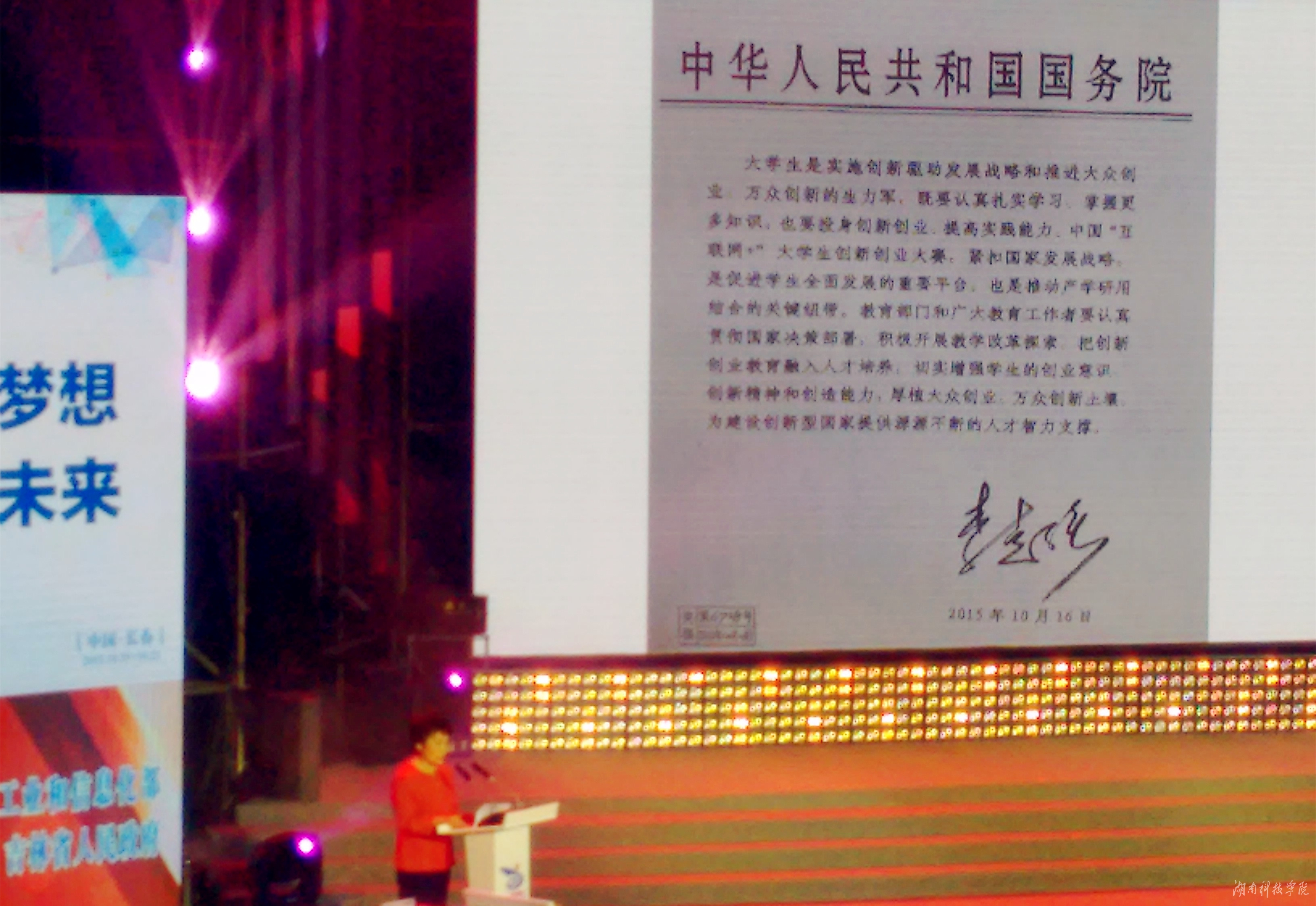 国务院总理李克强对大赛作出重要批示,强调指出:中国“互联网+”大学生创新创业大赛,紧扣国家发展战略,是促进学生全面发展的重要平台,也是推动产学研用结合的关键纽带,教育部门和广大教育工作者要认真贯彻国家决策部署,厚植大众创业、万众创新土壤,为建设创新型国家提供源源不断的人才智力支撑。