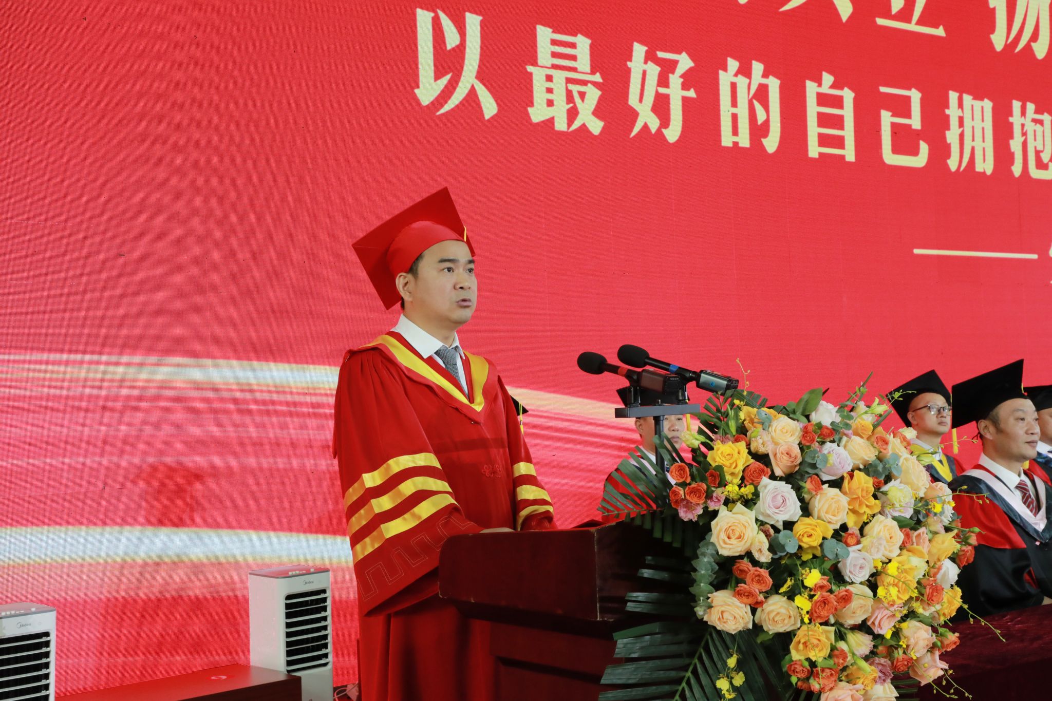 毕业典礼在雄壮嘹亮的国歌声中拉开帷幕。