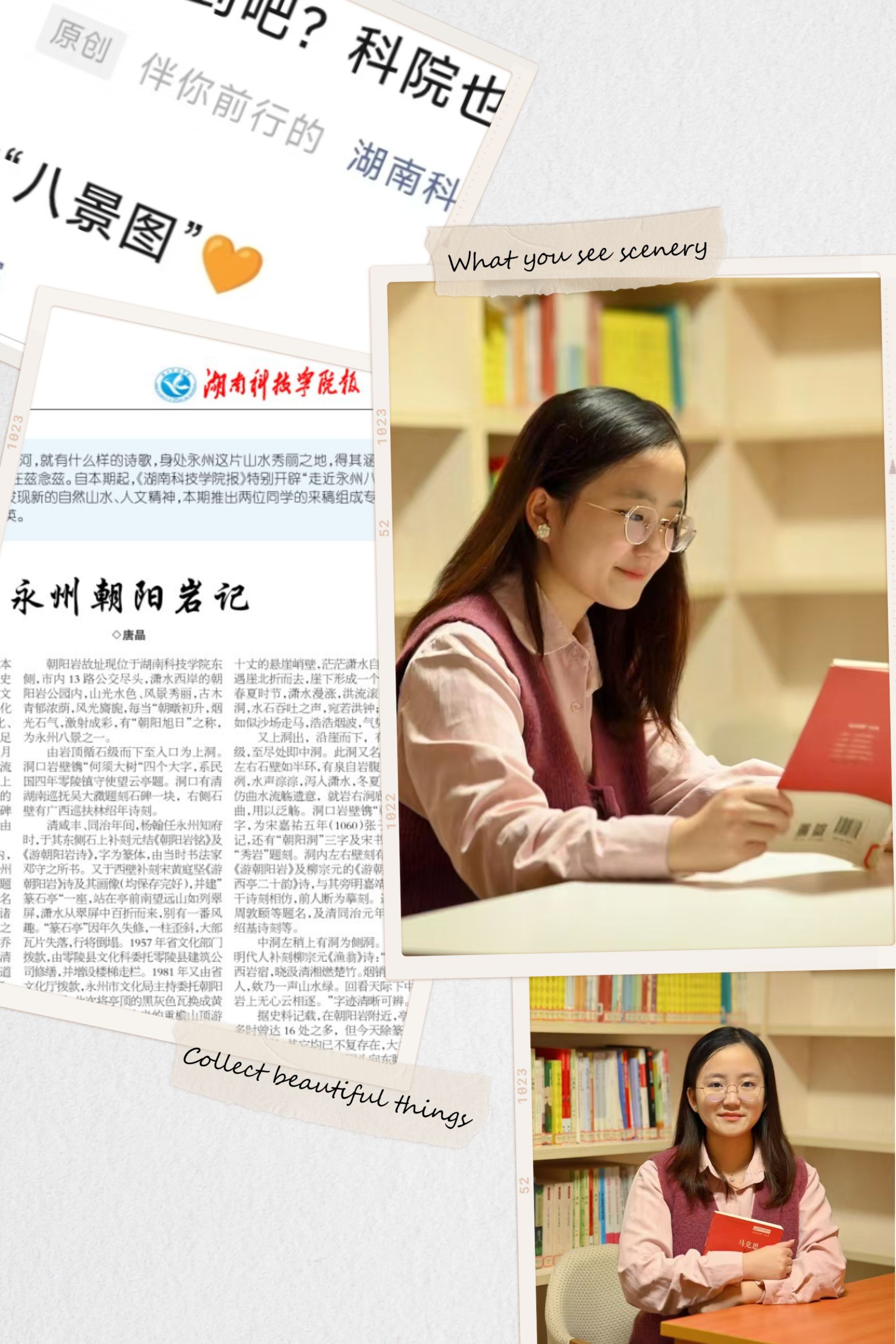 在我印象最深刻的一次创作经历中,我和十几位志同道合的伙伴共同推进并策划了一个项目——《华体会官方版网站登录入口报》特设的“走近永州八景”专栏。我们不仅在校内发起了征稿活动,还组织了多场线下活动,旨在鼓励师生们从全新的角度探索永州的自然美景与深厚的人文精神,以此来传递永州八景丰富的文化价值。经过团队与老师们的反复讨论和精心准备,这一专栏最终赢得了校内外广泛的好评,成为了传承和推广永州文化的一股重要力量。作为此次项目的参与者之一,我深感自豪,因为这不仅是对永州八景文化的致敬,更是对我们团队努力成果的肯定。“每一份努力都藏着未来的光芒”,这句话成为了我继续前行的动力源泉。
