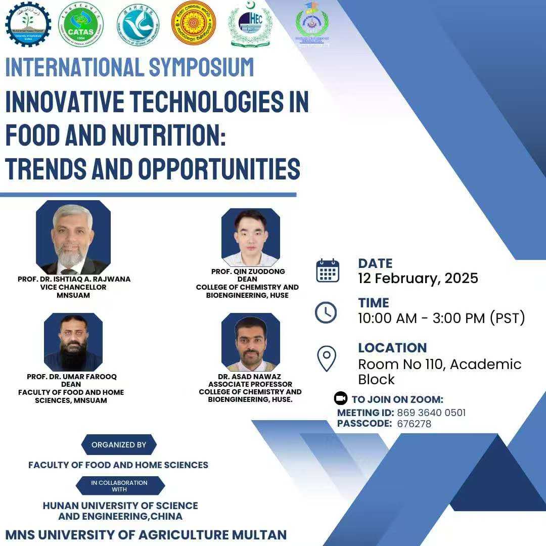 本网讯(通讯员 汪美凤)2月12日,由巴基斯坦Muhammad Nawaz Shareef University of Agriculture联合我校组织发起的“Innovative Technologies in Food and Nutrition: Trends and opportunities”(食品与营养创新技术:趋势与机遇)国际研讨会在巴基斯坦木尔坦以线上线下相结合的方式成功召开。来自巴基斯坦、中国、斯里兰卡等国家和地区的百余名专家学者出席了本次研讨会,共同探索食品营养的最新技术与未来发展趋势。