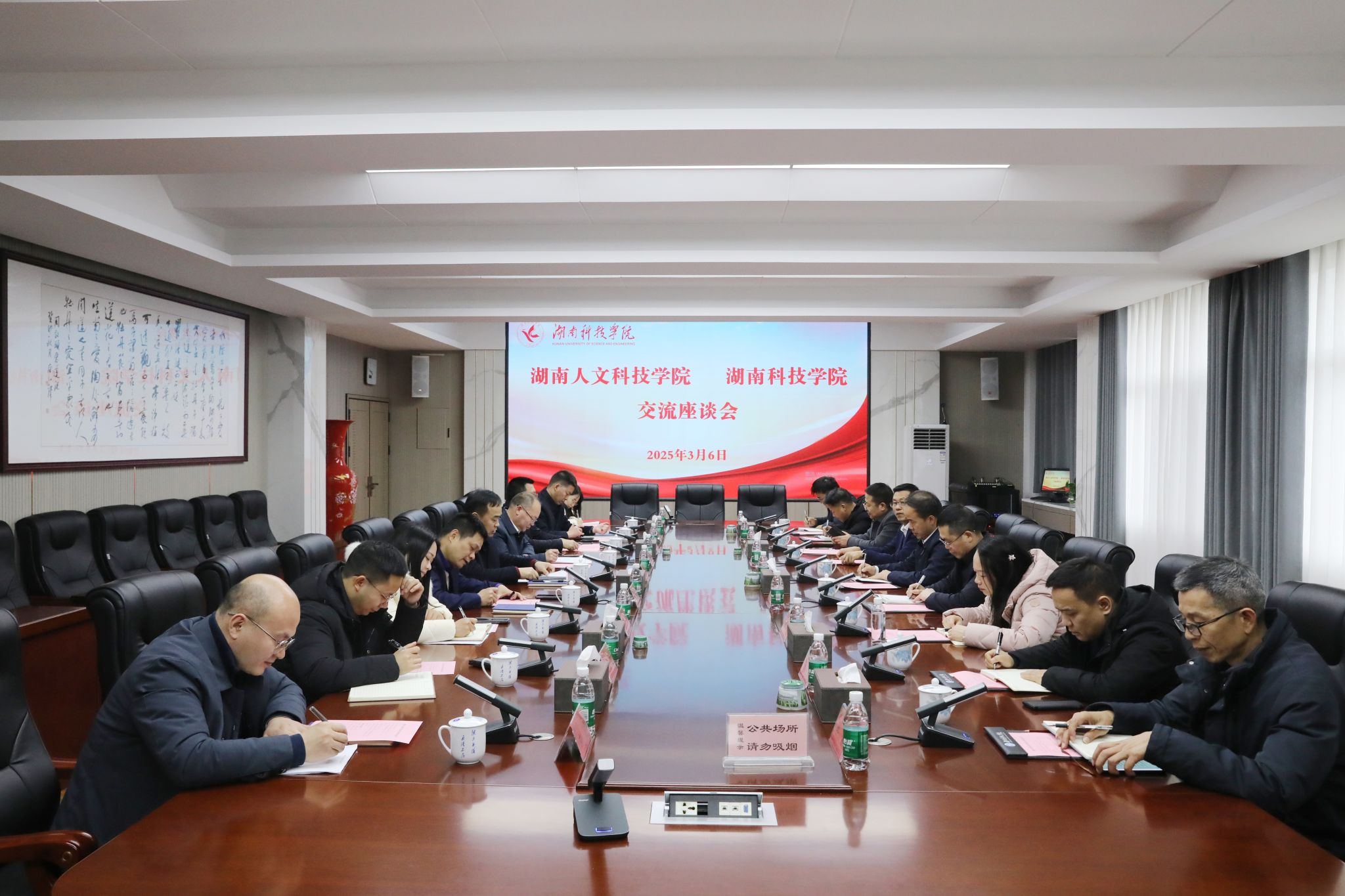 本网讯(记者 向薛峰 刘传意 摄影 谢志豪)3月6日下午,湖南人文科技学院党委副书记、校长盛明科,党委委员、副校长陈勇及相关部门负责同志来我校考察交流。校党委副书记、校长黄创霞,党委委员、副校长何海在行政楼613会议室会见了盛明科一行并进行座谈交流,相关部门负责人参加座谈,座谈会由何海主持。
